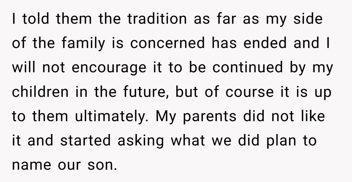 How to move forward? A calm conversation with his parents, acknowledging their love for the tradition while explaining how the name’s burden shaped his decision, could foster understanding. Reassuring them that his choice isn’t a rejection of family but a step toward his own identity might soften the blow. Setting firm boundaries against guilting his wife is key. Readers, would you end a family naming tradition that caused you pain, or try to honor it in some way? Share your thoughts below!