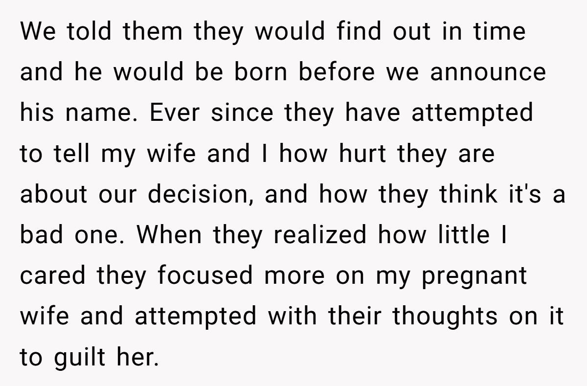 Commenters slammed the parents for guilting the Redditor and his wife, especially targeting her pregnancy, signaling future boundary issues