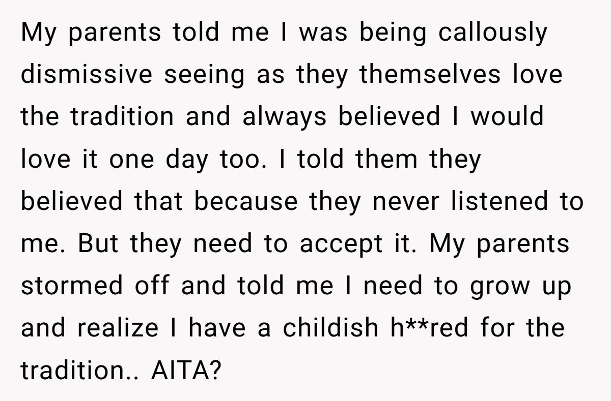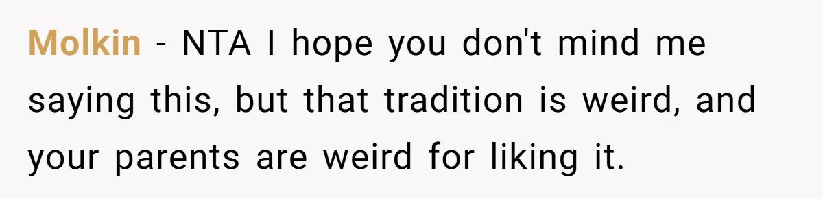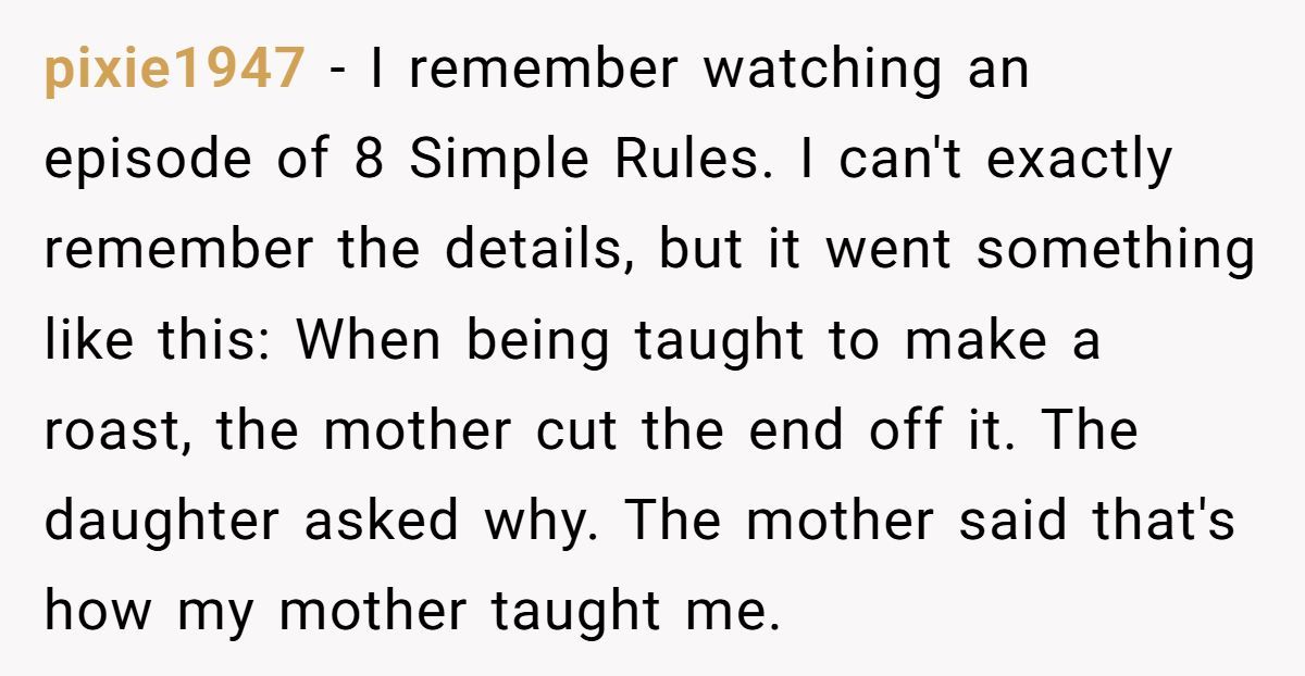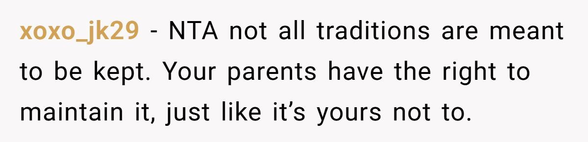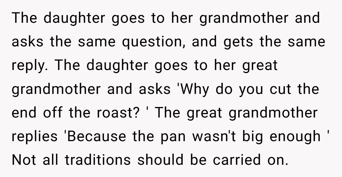 One user likened traditions to outdated peer pressure, sharing a story about a pointless roast-cutting habit to argue some customs don’t deserve to continue