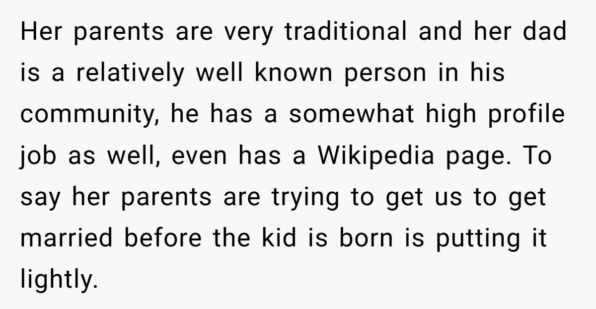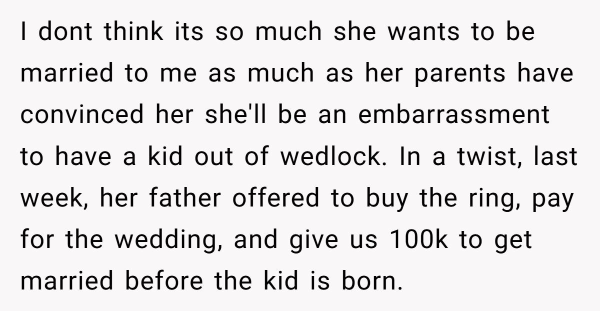 That’s exactly what happened to one Redditor who found himself facing not just fatherhood, but a tidal wave of pressure from his girlfriend’s traditional family. After his girlfriend became pregnant only three months into dating, things escalated quickly. Her influential father went so far as to offer him $100,000, a free ring, and a wedding—not out of love, but to preserve the family’s reputation.