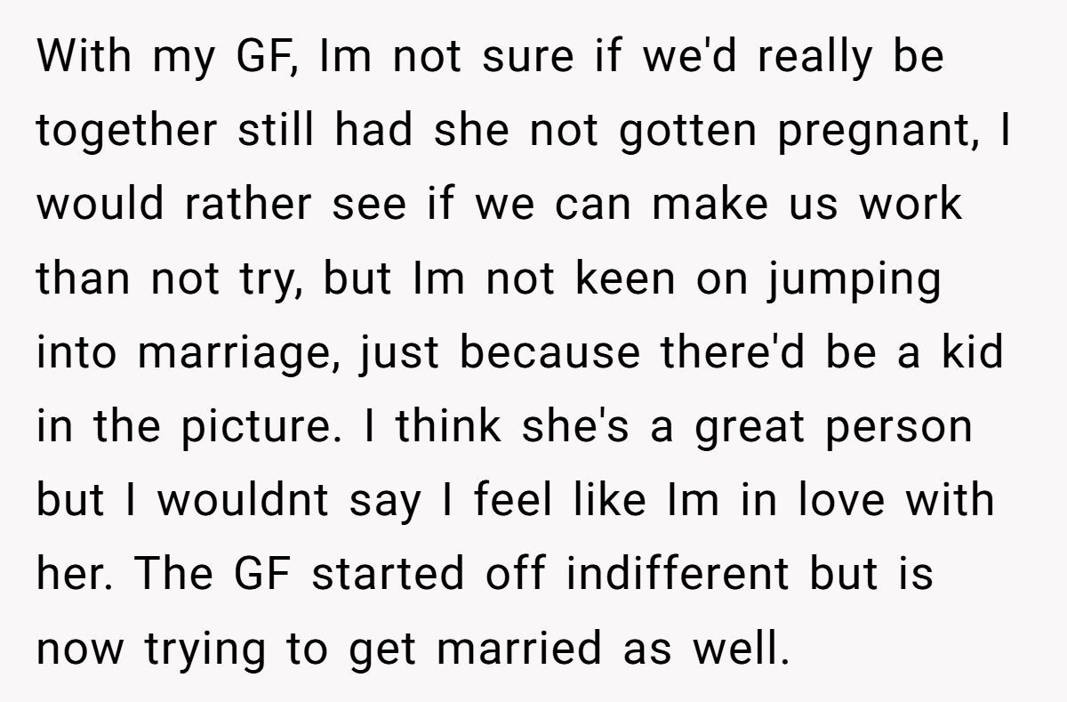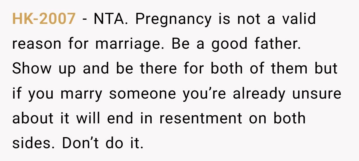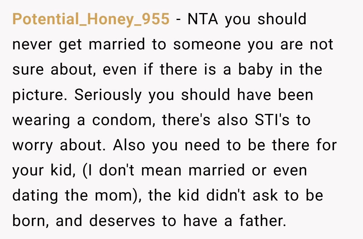 This Redditor may not have planned for fatherhood—or the firestorm that followed—but he’s stepping up in the way that matters: with honesty, emotional clarity, and a fierce determination to do right by his child. That doesn’t mean tying the knot just to silence whispers or cash a check.