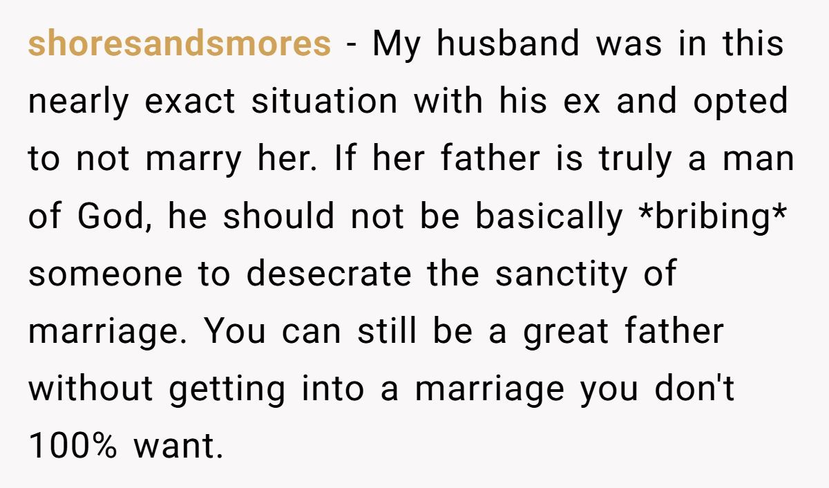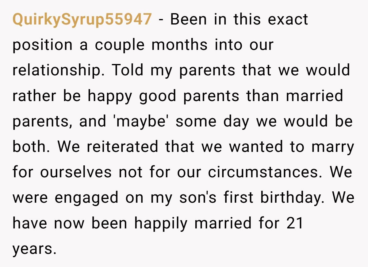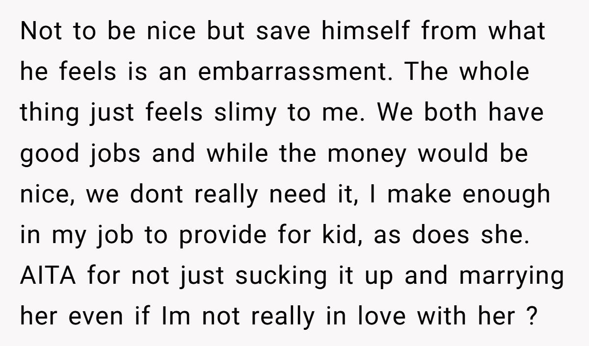 This Redditor seems to understand that. Despite the enormous social pressure—and even financial incentive—he made a choice to prioritize long-term emotional health over short-term appearances. His willingness to co-parent responsibly, without rushing into a legally binding commitment, is not only valid—it’s mature.