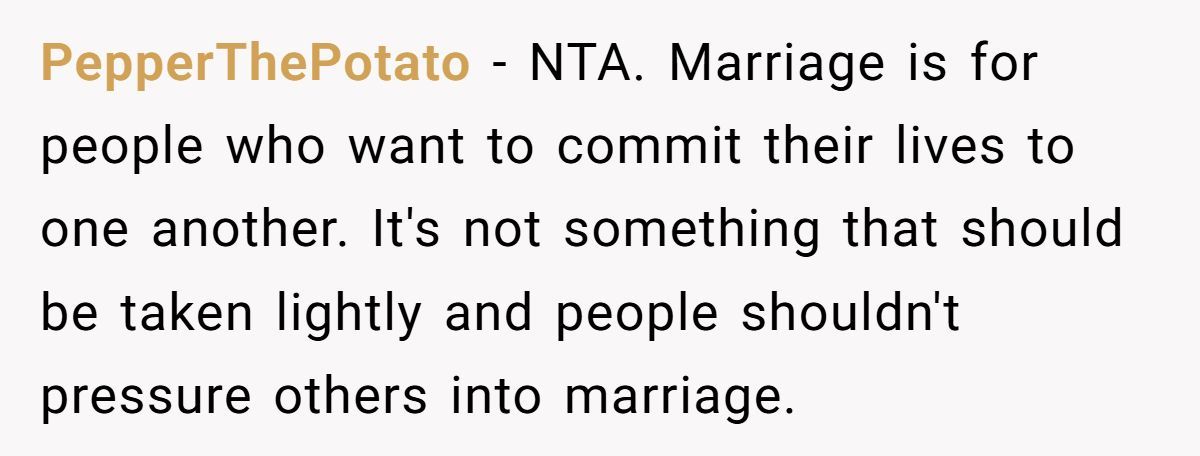 Reddit users rallied behind OP for resisting a shotgun wedding, especially when love wasn’t in the picture because marriage with the wrong person is a nightmare