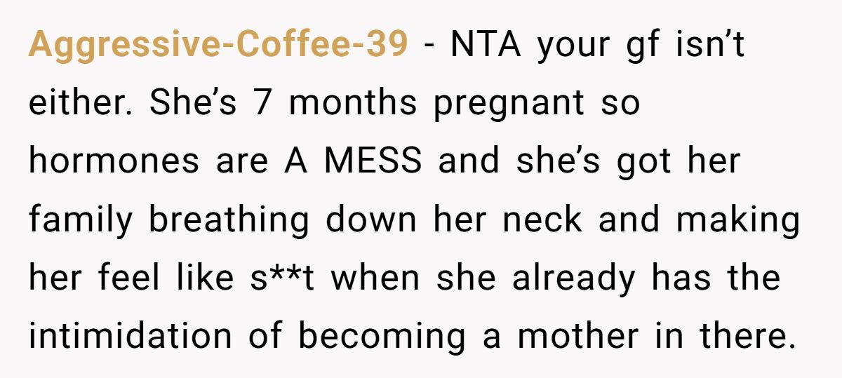This commenter noted the girlfriend’s hormonal stress and parental pressure, calling her situation tough but not the Redditor’s fault