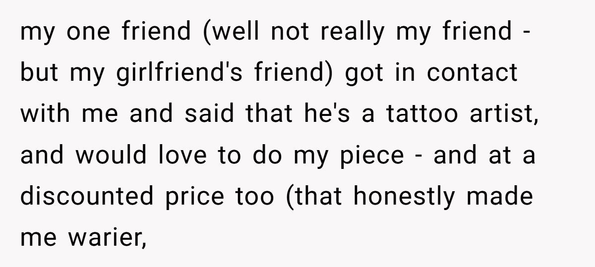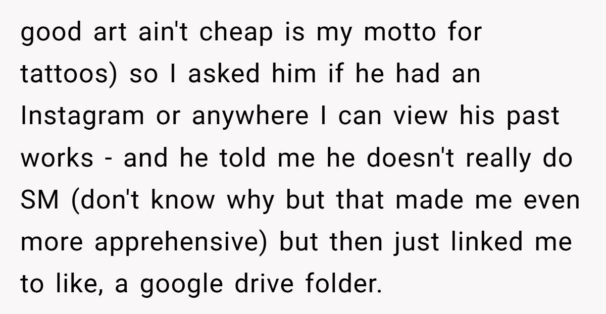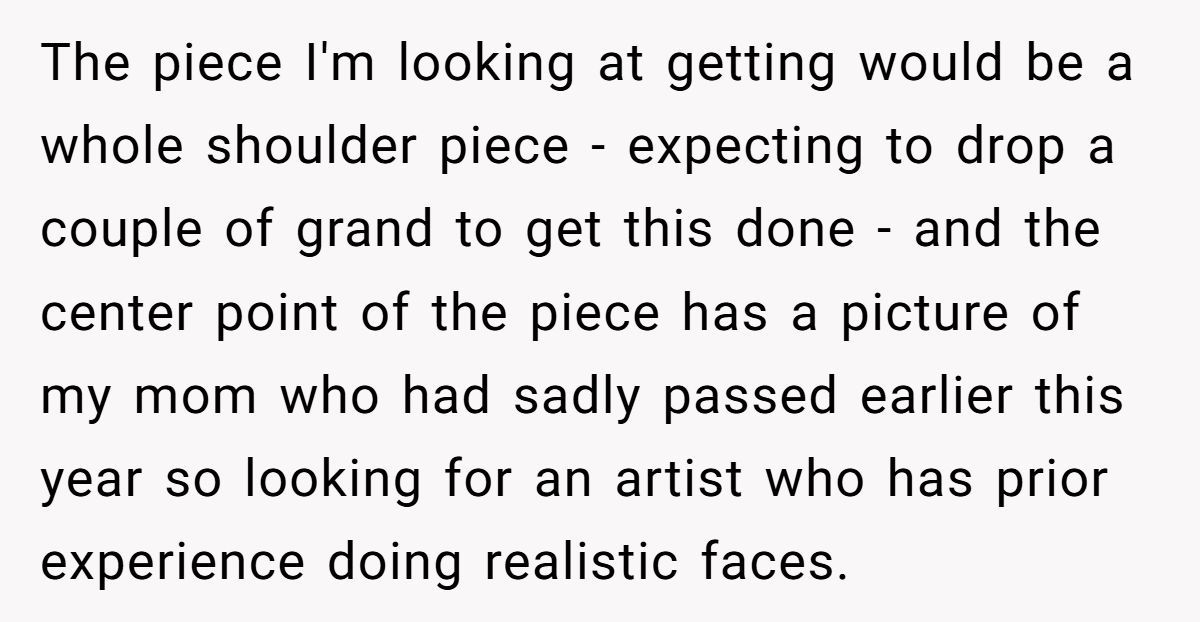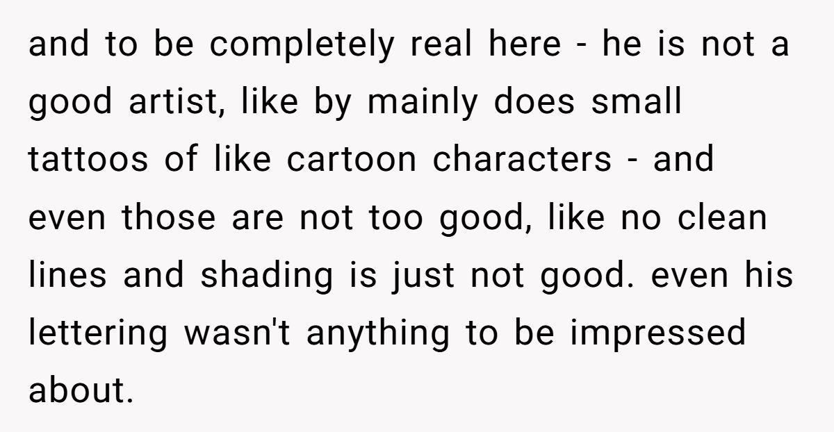 This Redditor’s journey started with good intentions—he wanted a meaningful shoulder tattoo to commemorate his mom. Enter his girlfriend’s friend, an aspiring tattoo artist, who offered to do it. One look at the guy’s portfolio revealed shaky lines, uneven shading, and cartoon-style work that didn’t fit the serious tone of a memorial piece. The Redditor declined politely.