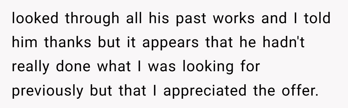 But the artist wouldn’t back off. Over the next two months, he kept asking. He even tried cornering the Redditor in the living room with a “surprise pitch,” backed by mutual friends. That’s when the Redditor finally snapped, telling him outright that his work was subpar and that he felt sorry for the people who had to live with it. Ouch.