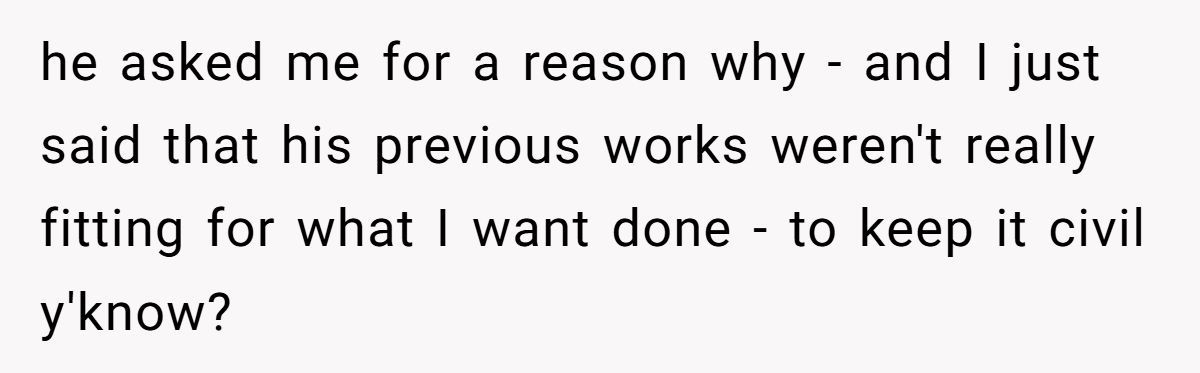 A sincere apology for the delivery (not the decision) could help smooth things over. The Redditor still has the right to choose his artist. His girlfriend, meanwhile, should recognize that her support needs to prioritize her partner’s wishes—not just her friend’s feelings. As for the artist, this could be a wake-up call to refine his craft, accept criticism, and learn when to step back.