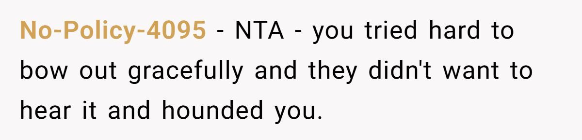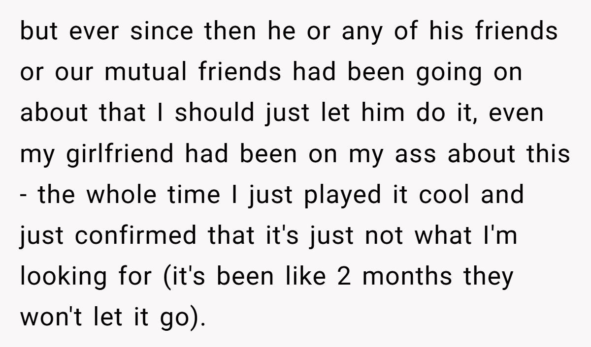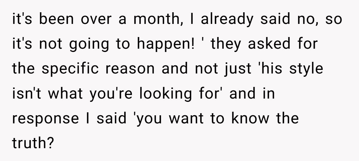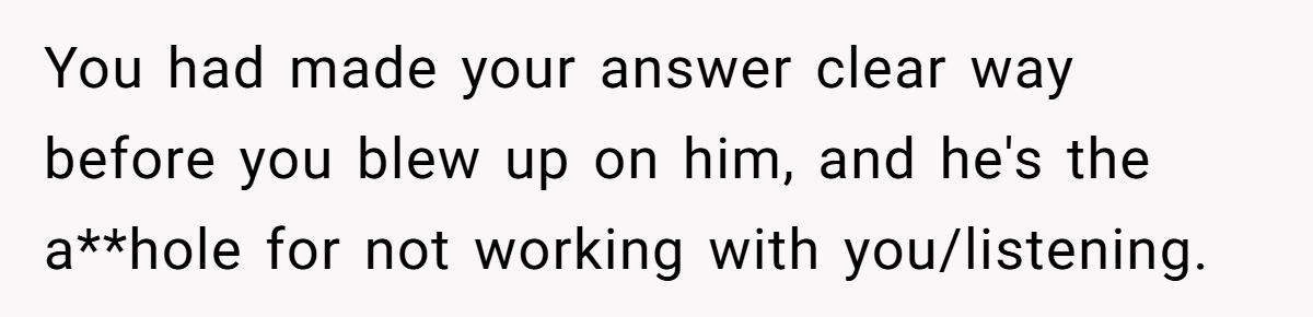 The Redditor’s final outburst may have been harsh, but after weeks of being cornered and guilt-tripped, it’s understandable. That said, a calmer approach—like saying “your style doesn’t align with what I’m looking for”—might’ve prevented the blowup. Unfortunately, the constant pressure turned a simple rejection into a bigger conflict.