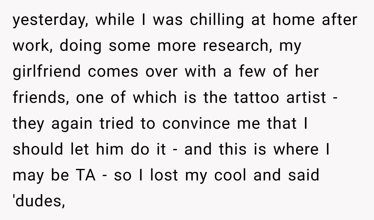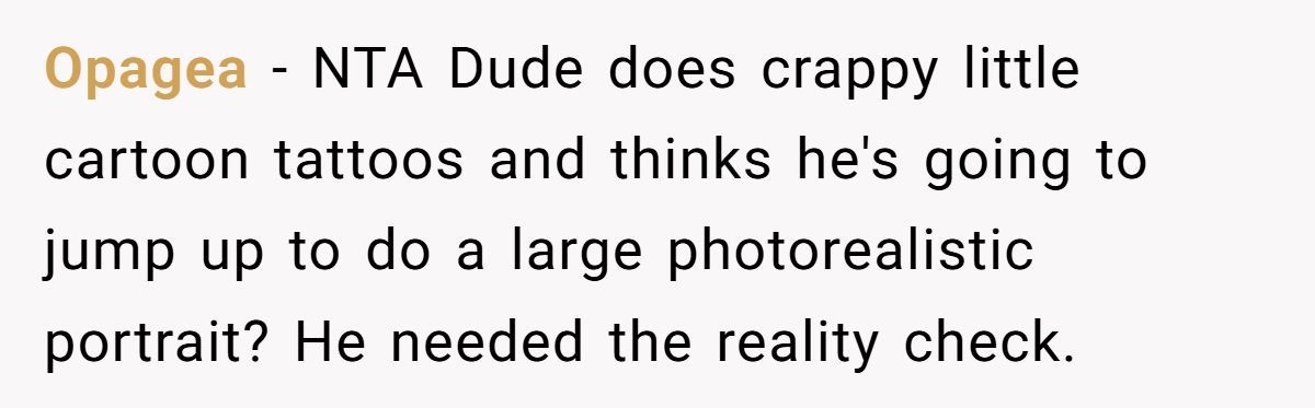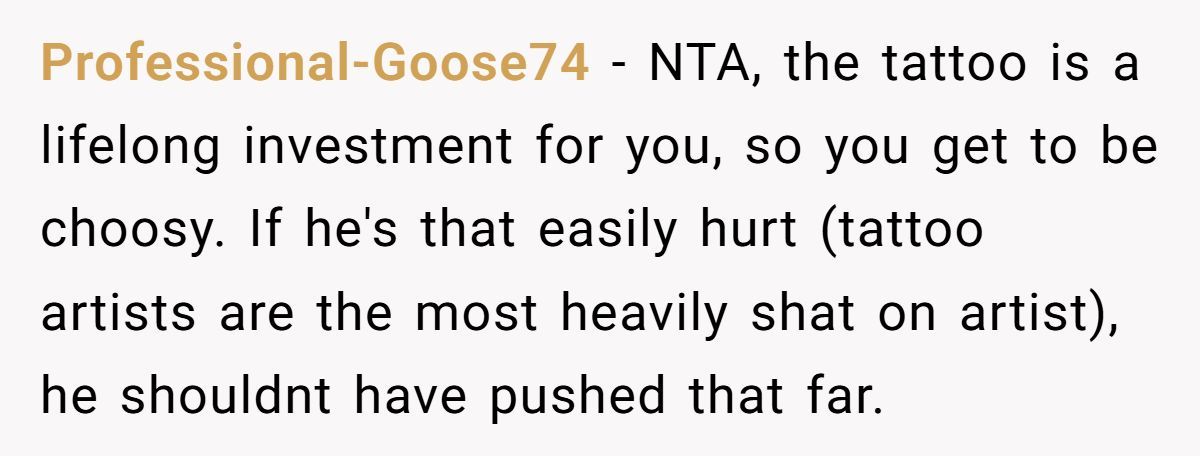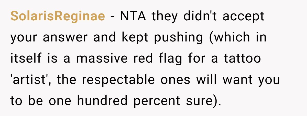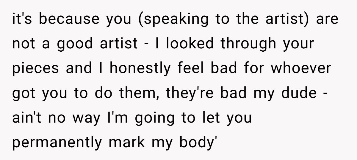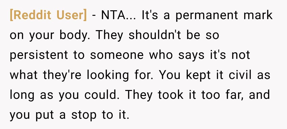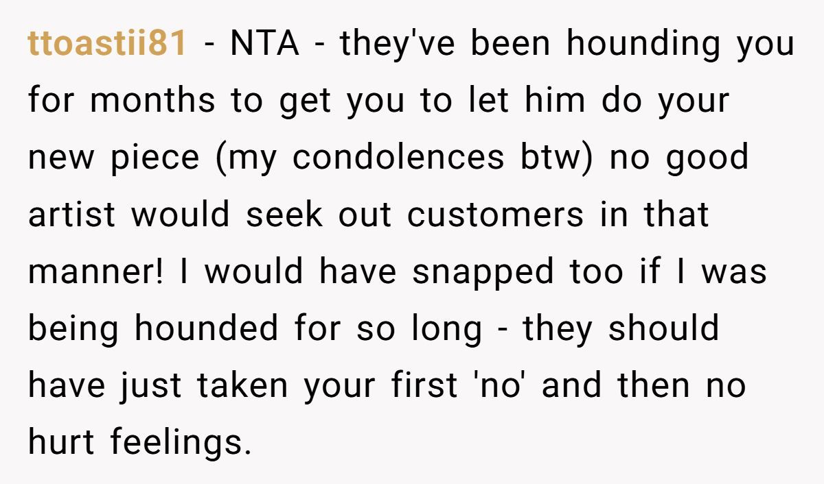 Commenters agreed the person was NTA. They had clearly said no, but the artist kept pushing. It’s their body, and standing firm wasn’t rude—it was necessary.