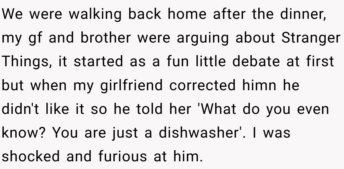 His girlfriend and 13-year-old brother had been getting along… until a nerdy debate over Stranger Things got too real. A harmless disagreement escalated when the brother called the girlfriend a “dishwasher.” Yep, that happened. One sexist, offhand jab later, the girlfriend stormed off, the brother tried to laugh it off, and the Redditor found himself in the emotional equivalent of a hostage situation—with no escape but the couch.