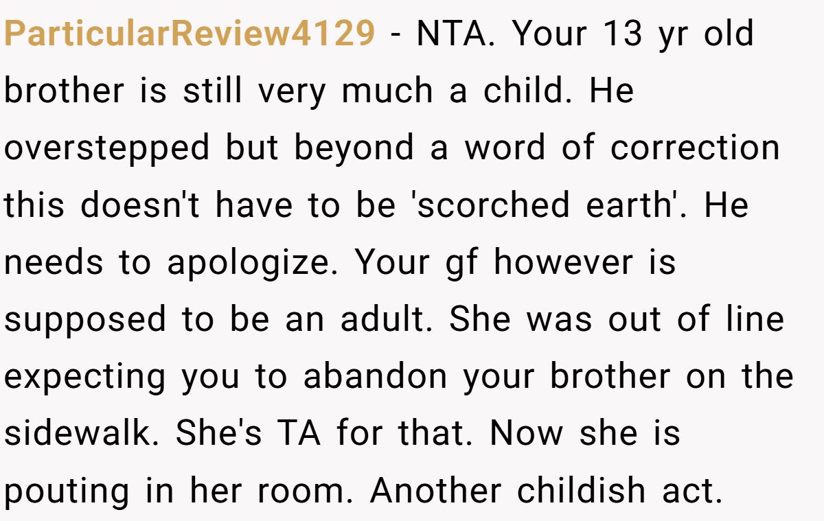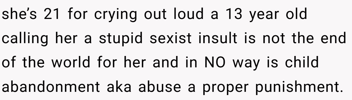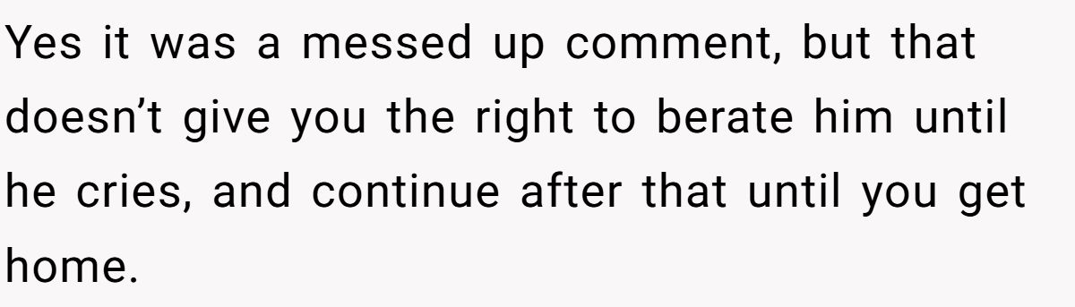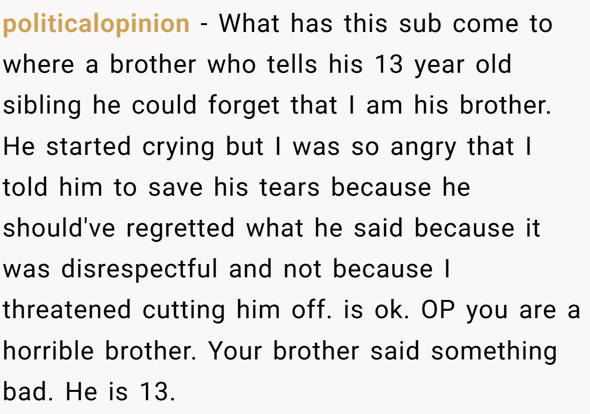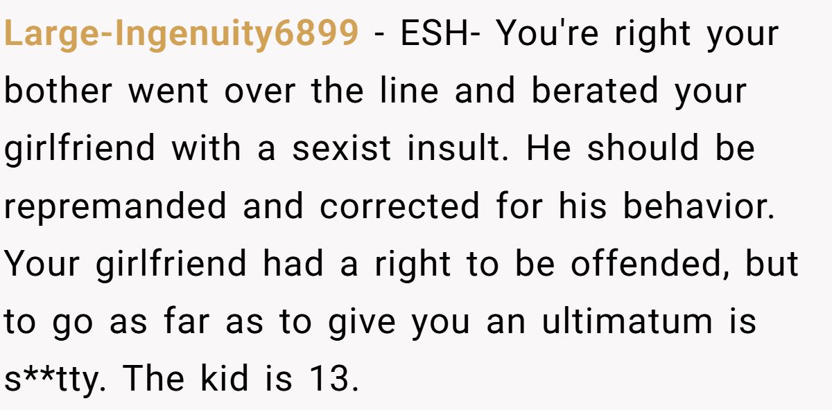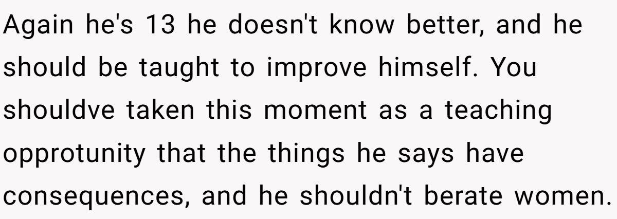 The brother’s comment—clearly sexist and inappropriate—was likely parroted from peers or online culture. At 13, boys are still forming their worldview. Discipline at this age should be deliberate and educational, not emotionally punishing. Instead of berating him into tears or threatening estrangement, a more productive approach could have involved clear conversation about respect, paired with real consequences like limited screen time or writing a reflection letter.