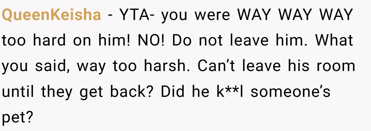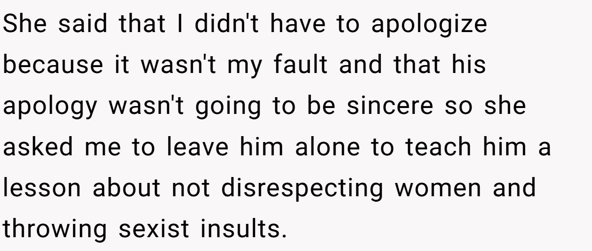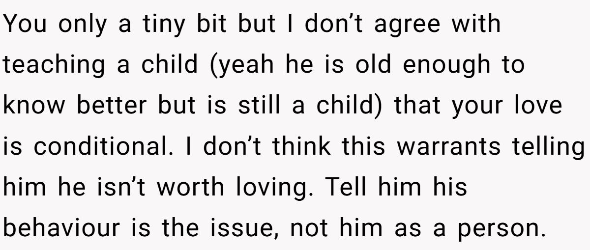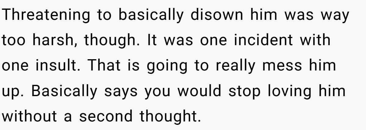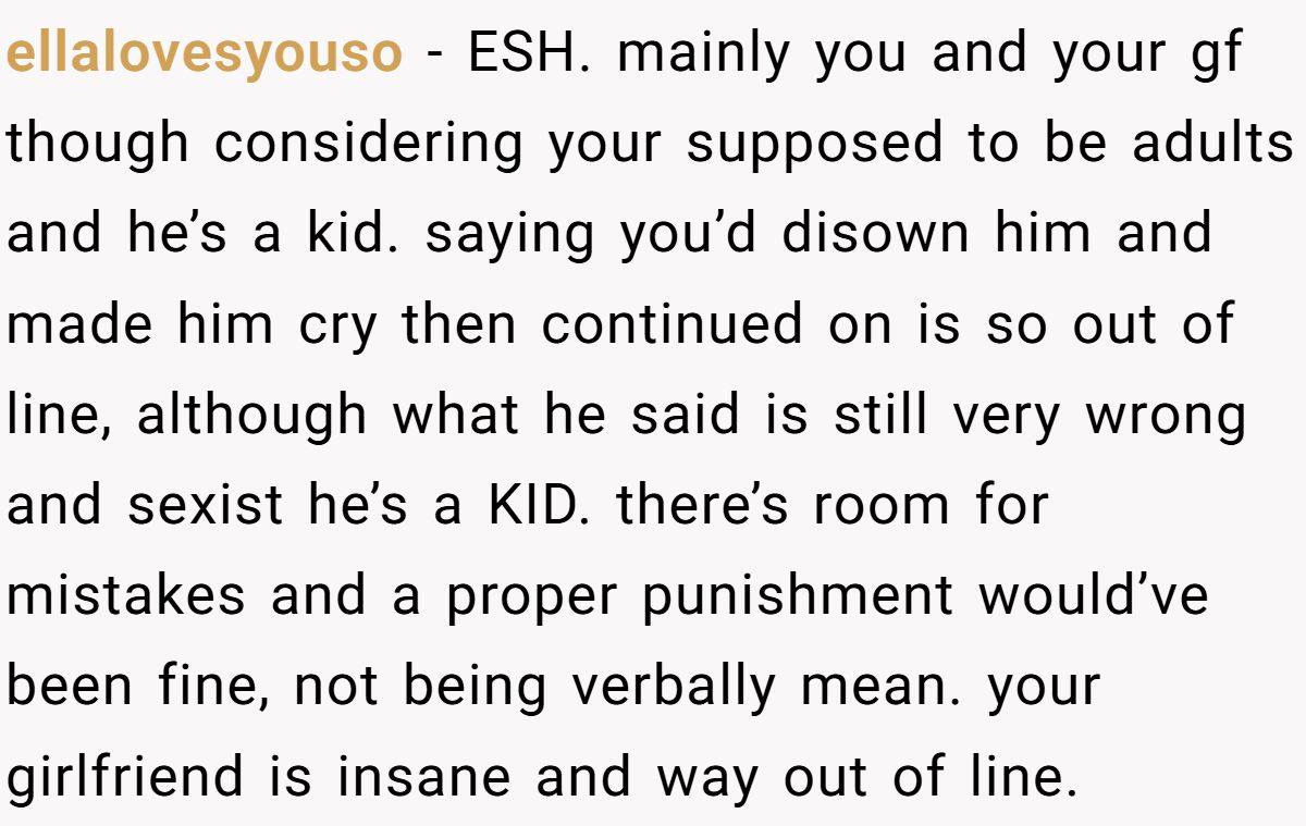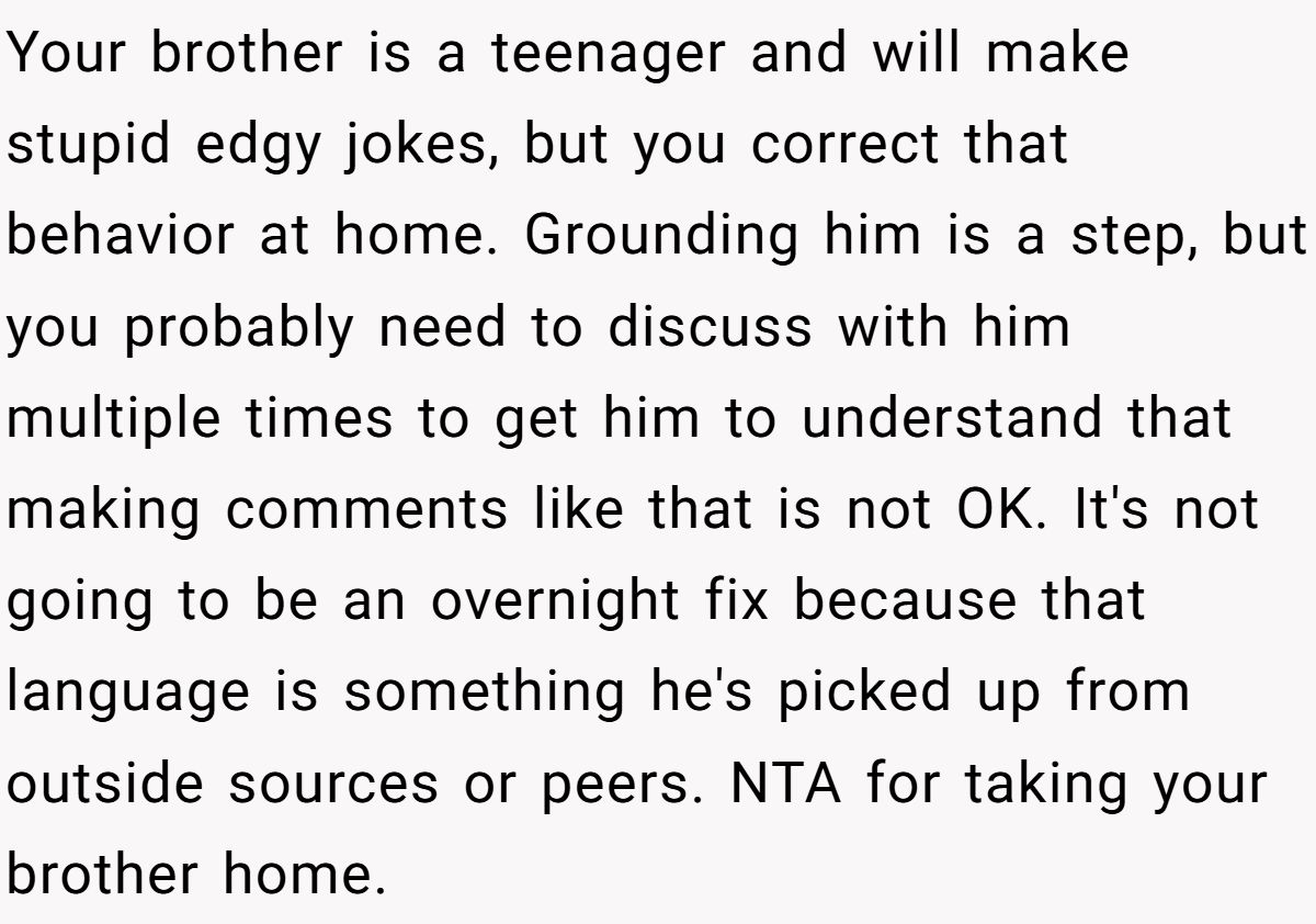 The brother’s comment—clearly sexist and inappropriate—was likely parroted from peers or online culture. At 13, boys are still forming their worldview. Discipline at this age should be deliberate and educational, not emotionally punishing. Instead of berating him into tears or threatening estrangement, a more productive approach could have involved clear conversation about respect, paired with real consequences like limited screen time or writing a reflection letter.