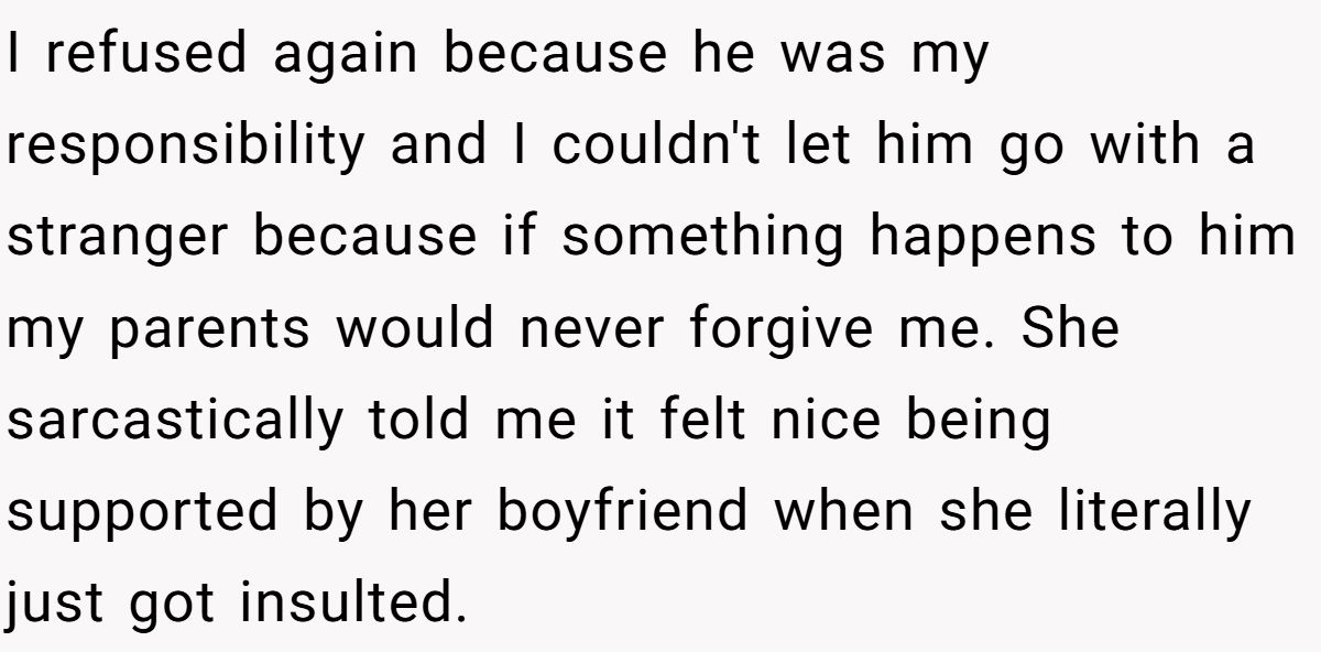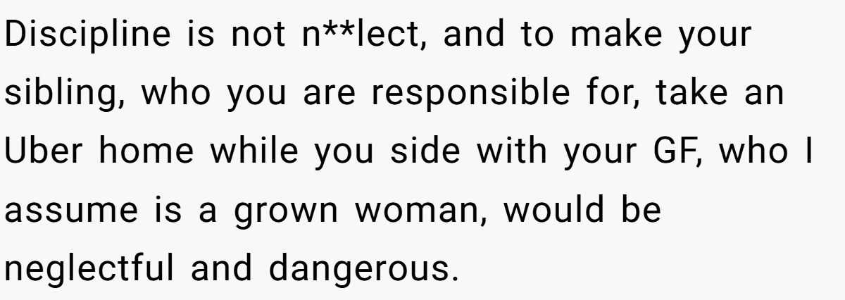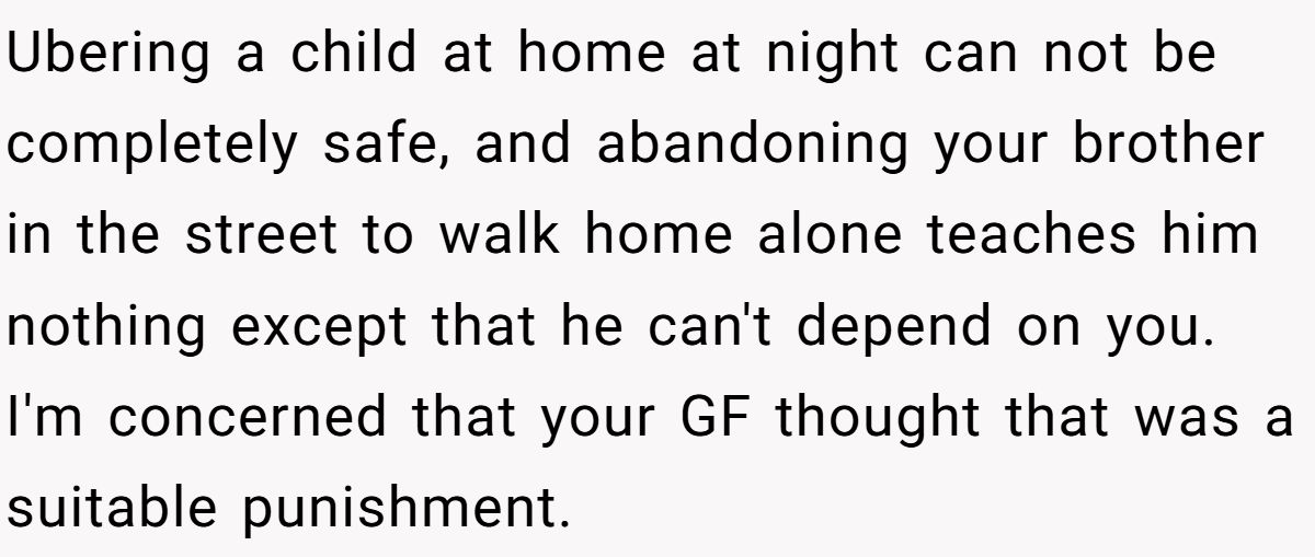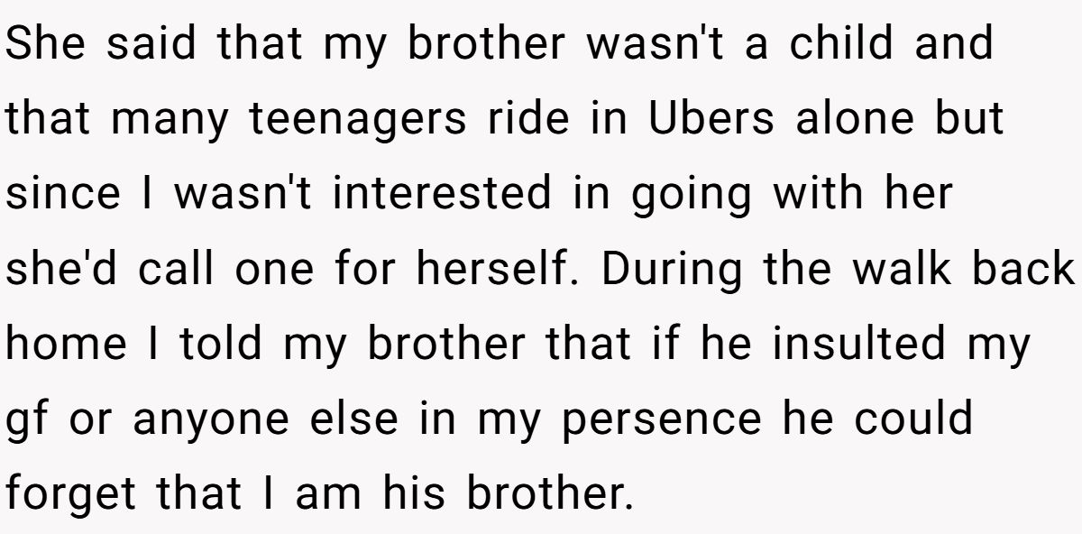 Now let’s address the girlfriend’s take. Her demand that the brother be left behind wasn’t just impractical—it was borderline dangerous. According to a CNN report, Uber prohibits unaccompanied minors under 18 from riding without an adult. So even if she felt unheard or unsupported, putting a child at risk was never a viable solution.