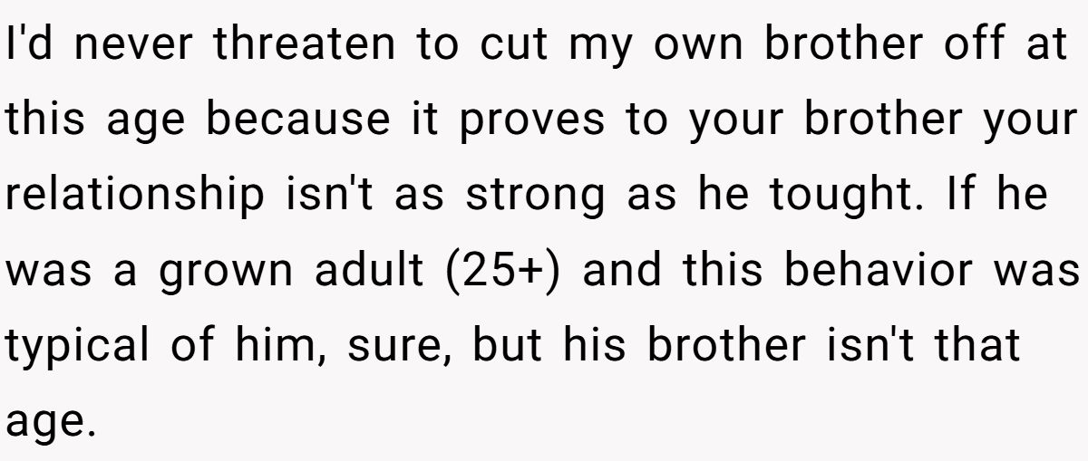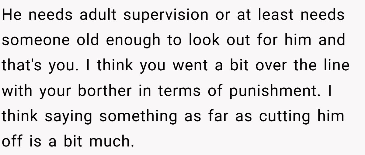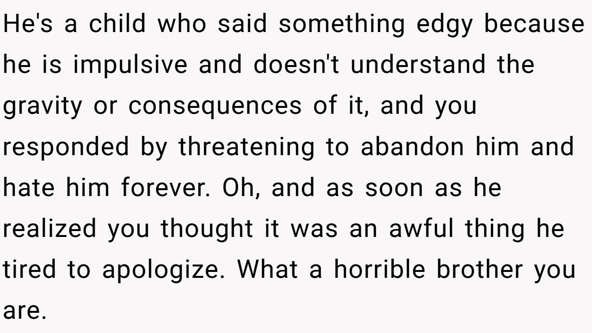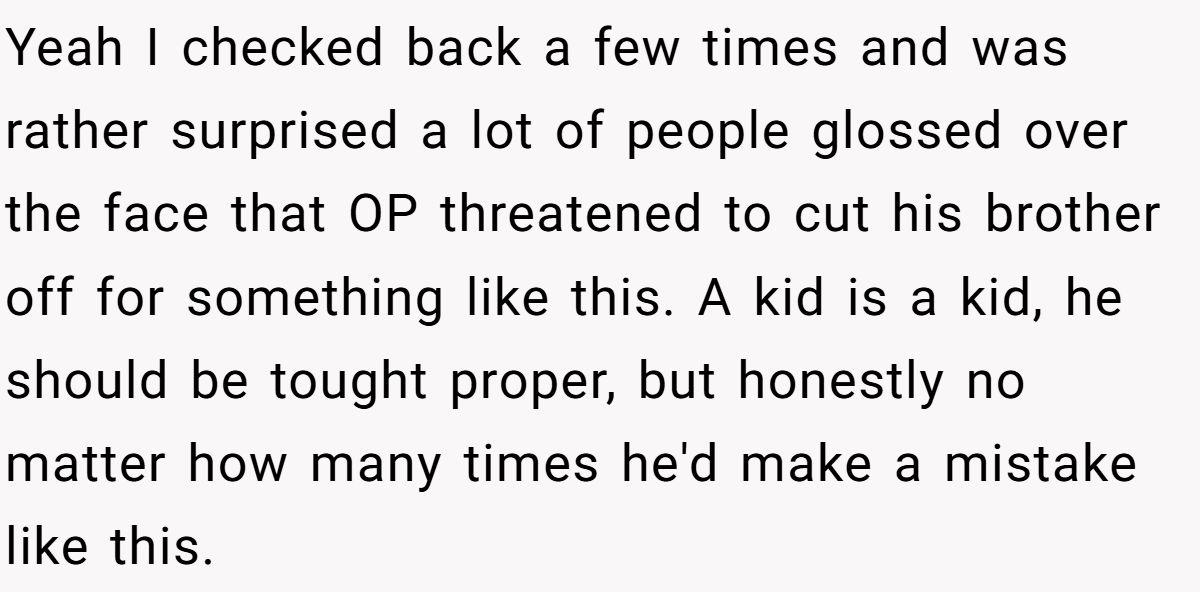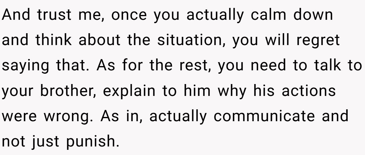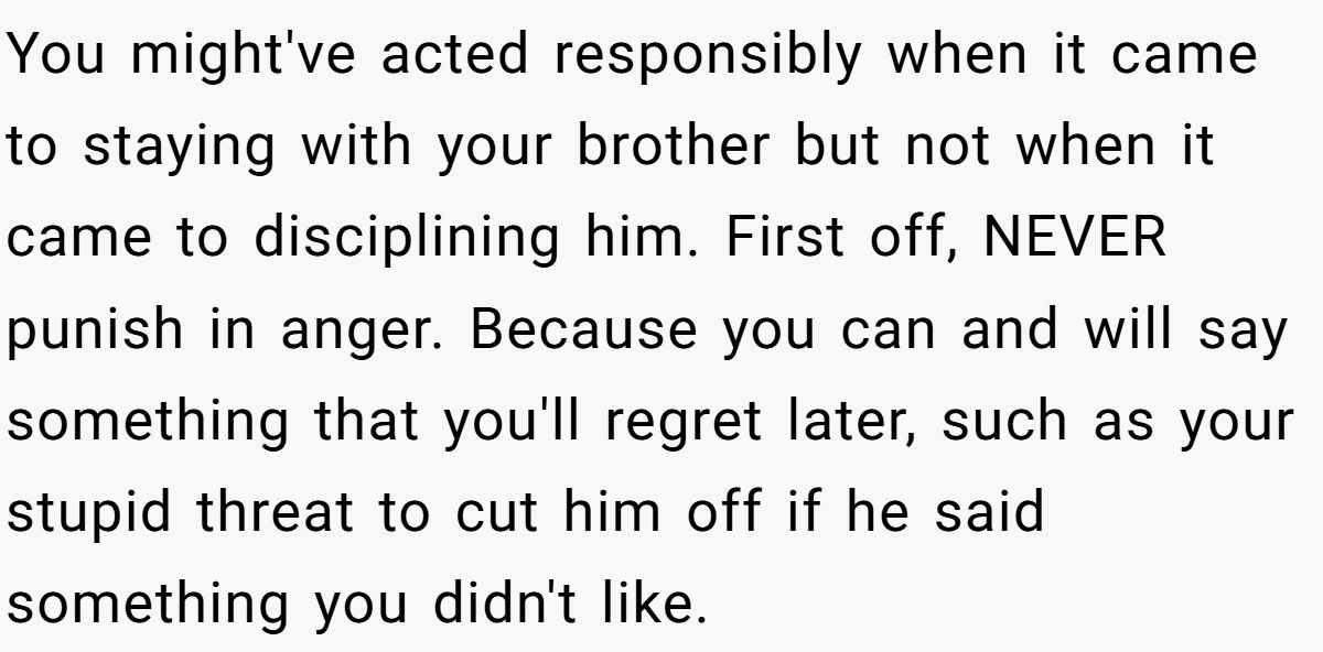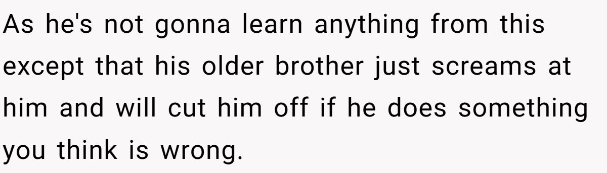 As for the Redditor himself? He was clearly torn—trying to act responsibly while juggling the emotional fallout. But in losing his temper, threatening to “cut off” his brother, and isolating him for days, he replaced guidance with guilt. Family therapist Dr. Laura Markham notes in her article for Aha Parenting, “Punishment teaches kids to avoid getting caught, not to make better decisions.” In short: the punishment may have landed, but the lesson probably didn’t.