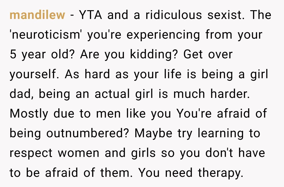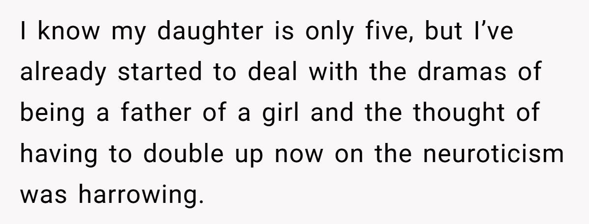 What this father expressed wasn’t just surprise or private sadness. His behavior communicated that daughters are somehow “less than.” Using phrases like “double up on the neuroticism” and being “outnumbered” reflects internalized gender biases that harm both daughters and the people raising them.