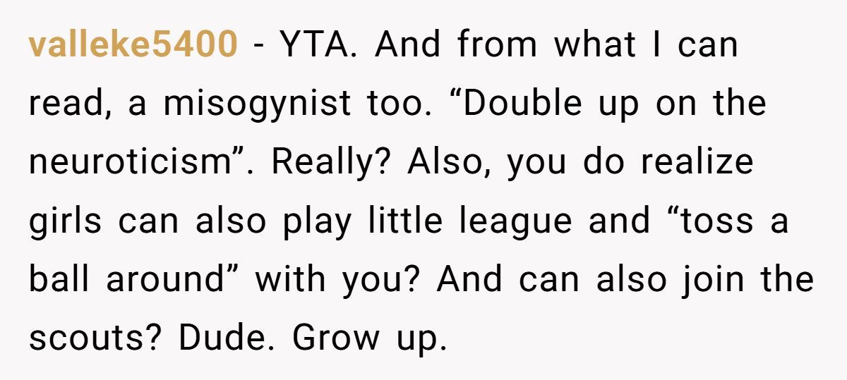 Users labeled him a misogynist for assuming girls can’t do sports or scouting and for dreading “neuroticism”