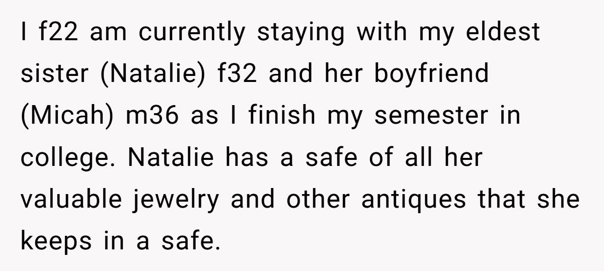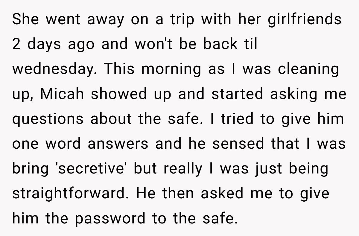 One Redditor faced an unsettling situation while staying with her sister Natalie and her boyfriend Micah. Tasked with guarding the password to Natalie’s safe, filled with heirloom jewelry and antiques, the Redditor refused Micah’s request for access while Natalie was away, despite his insistence and eventual yelling.