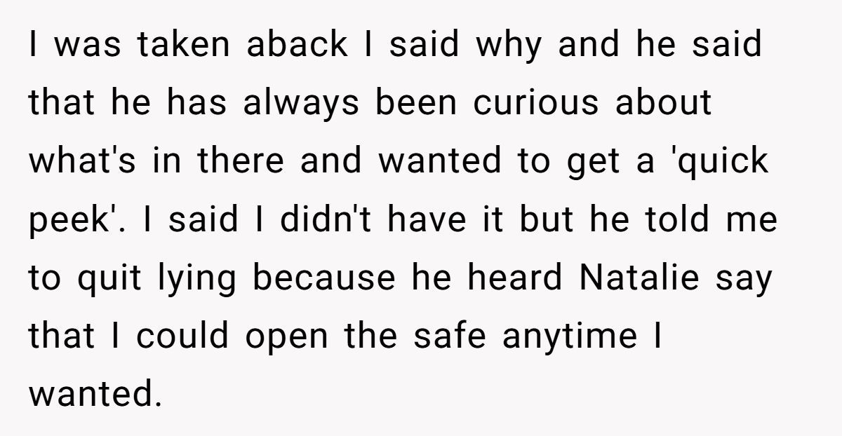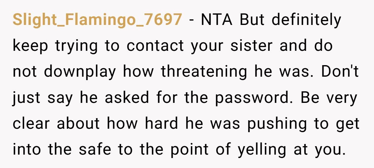 How to move forward? Contacting Natalie as soon as possible to share the full incident, including Micah’s aggression, is crucial to protect their trust and her safety. Staying with a friend or family member until Natalie returns could ease her anxiety. A calm but firm boundary with Micah, reiterating that the safe is Natalie’s domain, might prevent further conflict. Readers, would you hold firm on a sibling’s trust or yield to avoid a fight? Share your thoughts below!