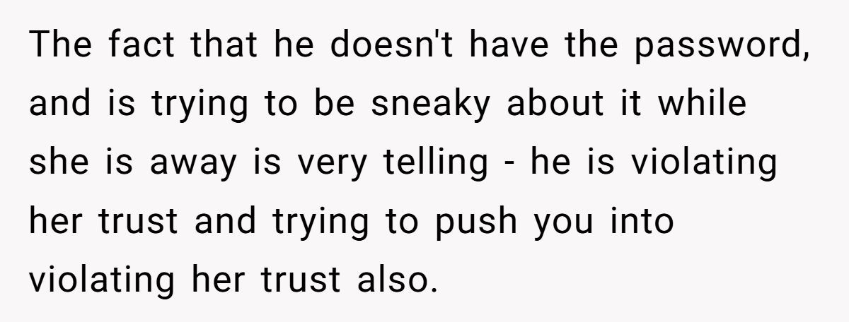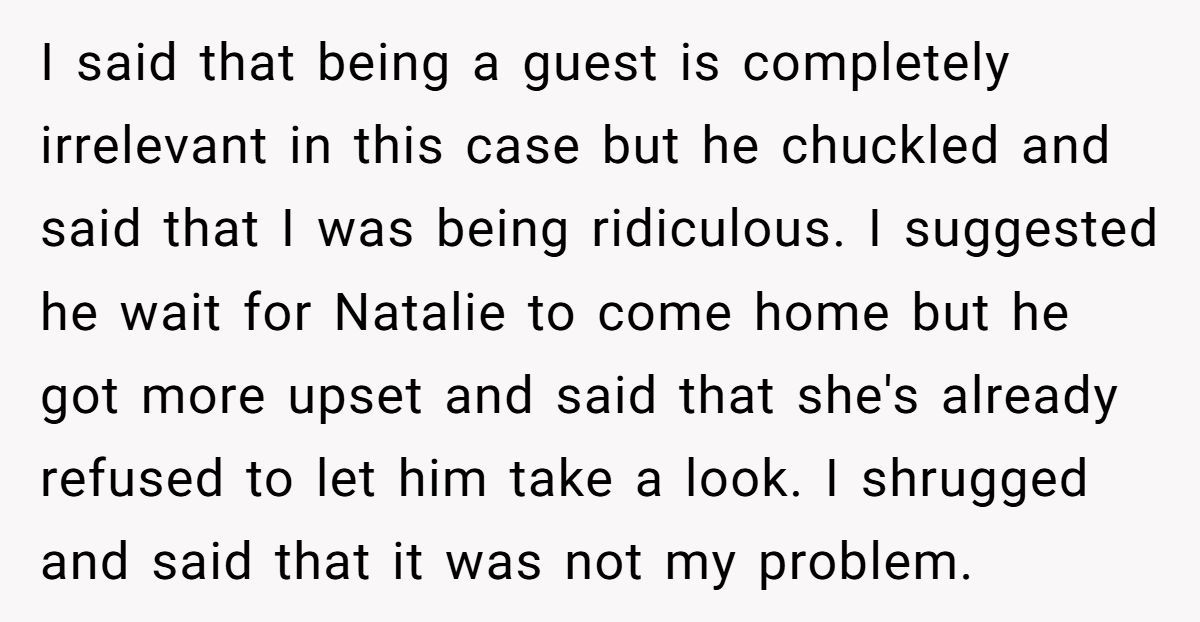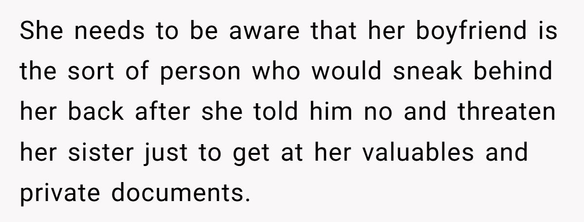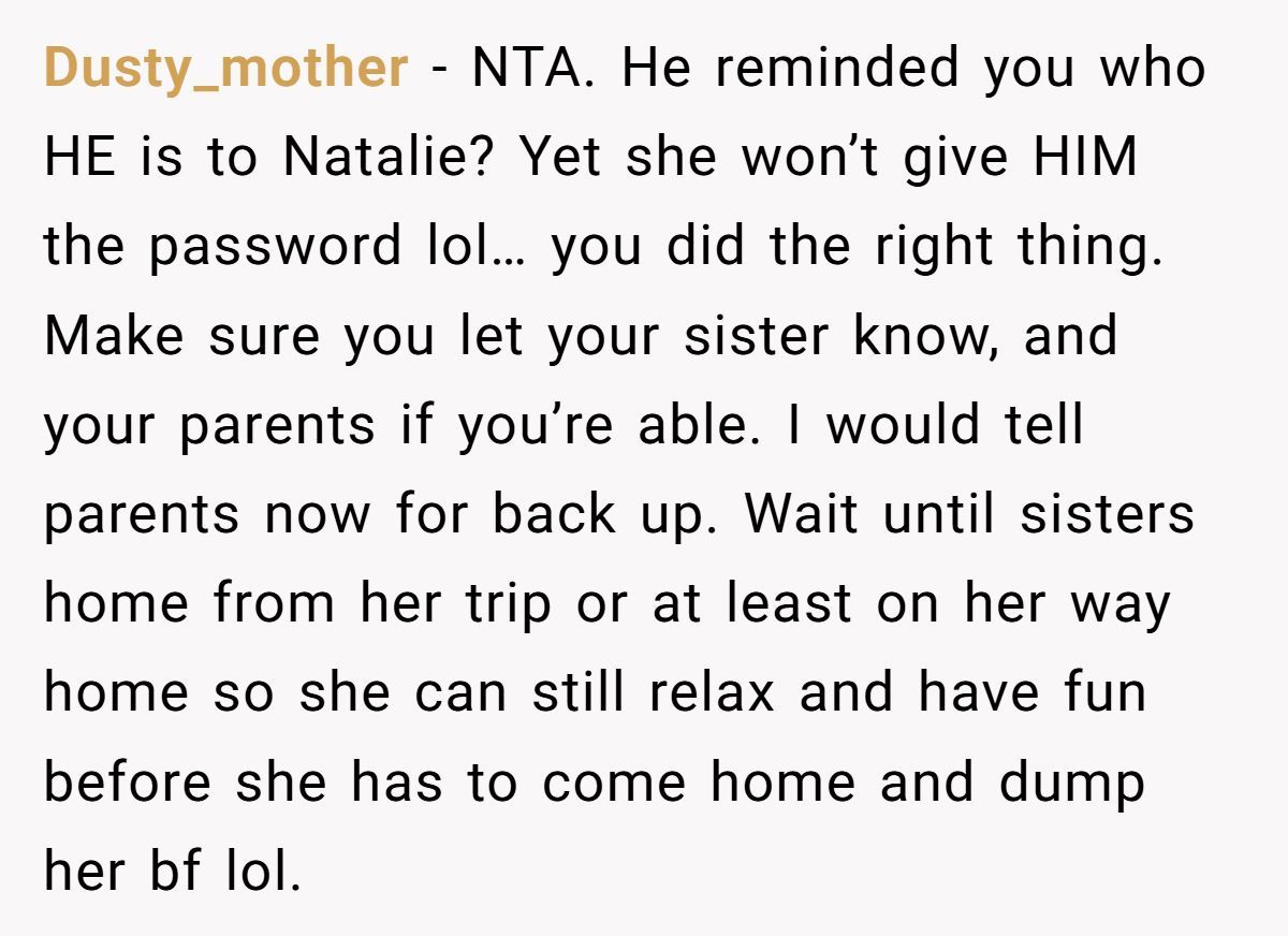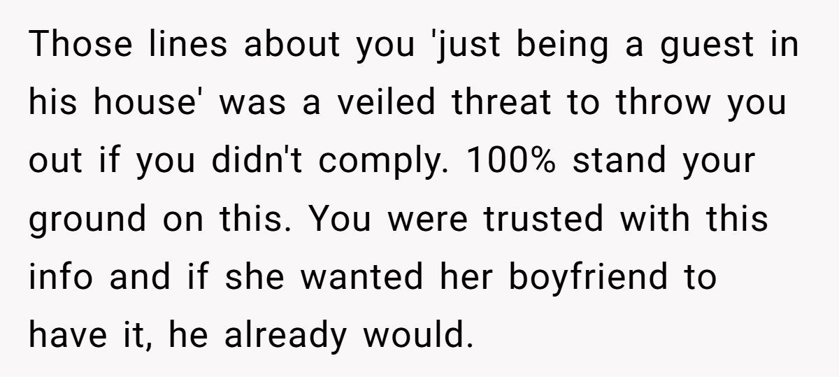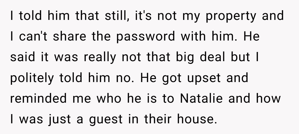 But the moment Natalie was out of town, Micah started pressing. What started as casual questions quickly escalated into persistent demands. And when OP refused? He yelled, belittled her for “being a guest,” and stormed out. She was left shaken and alone, questioning whether she’d done the right thing. Spoiler alert: Reddit had her back—and they had a lot to say about this boyfriend’s behavior.