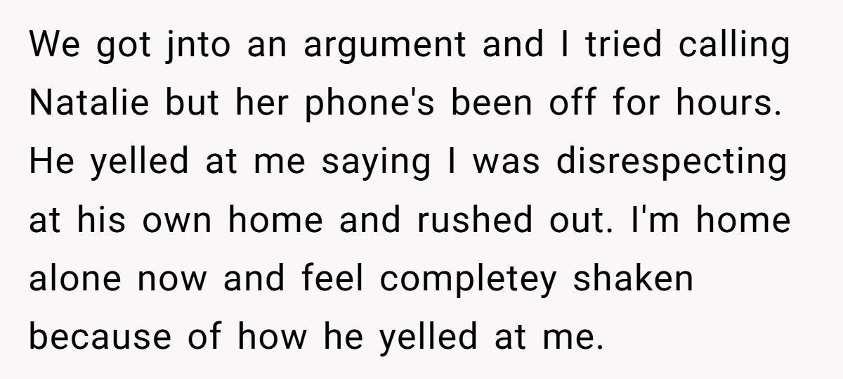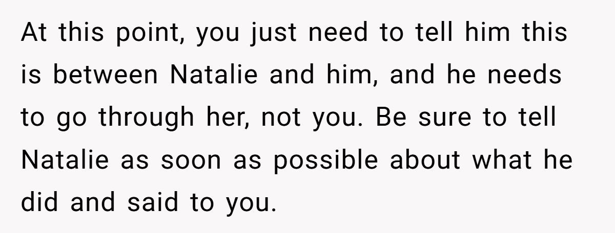 Commenters highlighted his yelling and “guest” remarks as veiled threats, urging her to tell Natalie and consider staying elsewhere for safety