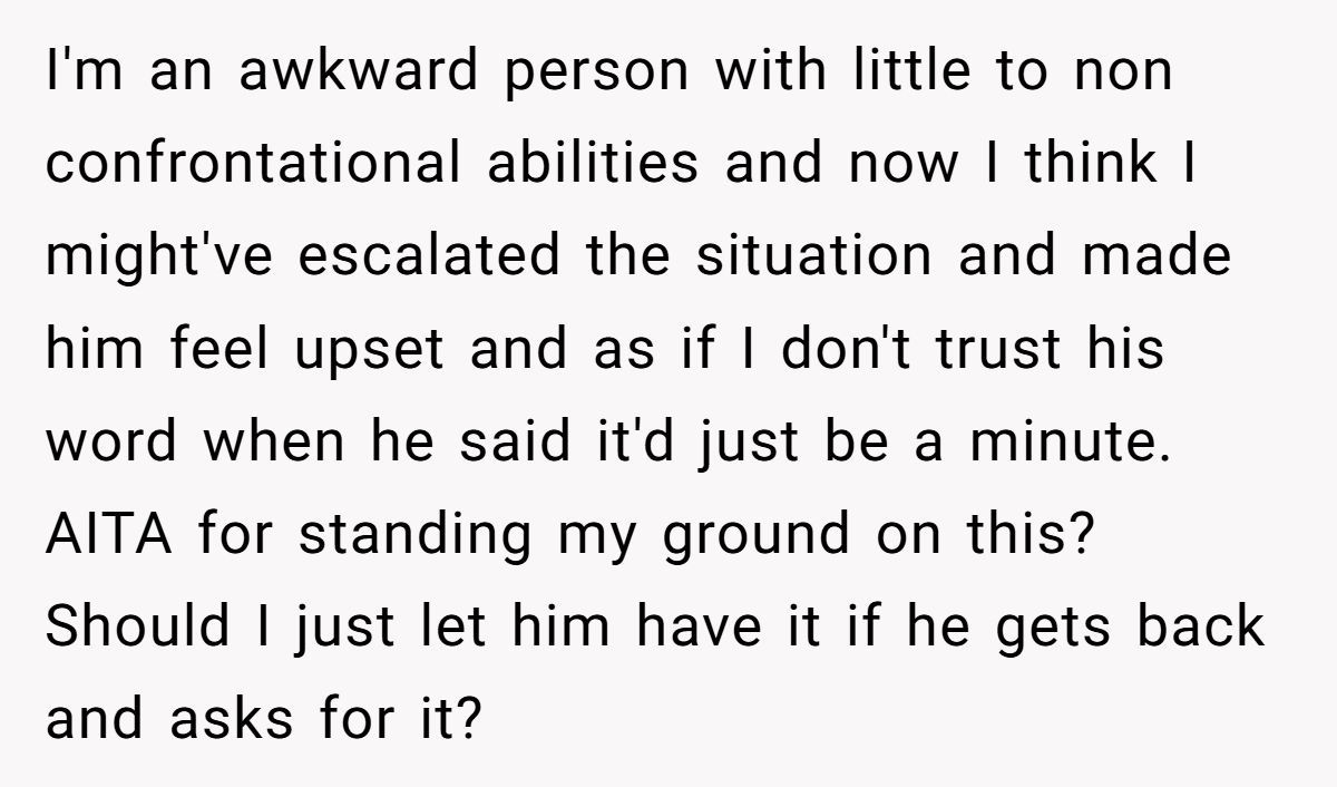 Shaken by his aggression and his claim that she was “just a guest,” she’s now questioning if standing her ground was wrong or if she should give in to keep the peace.