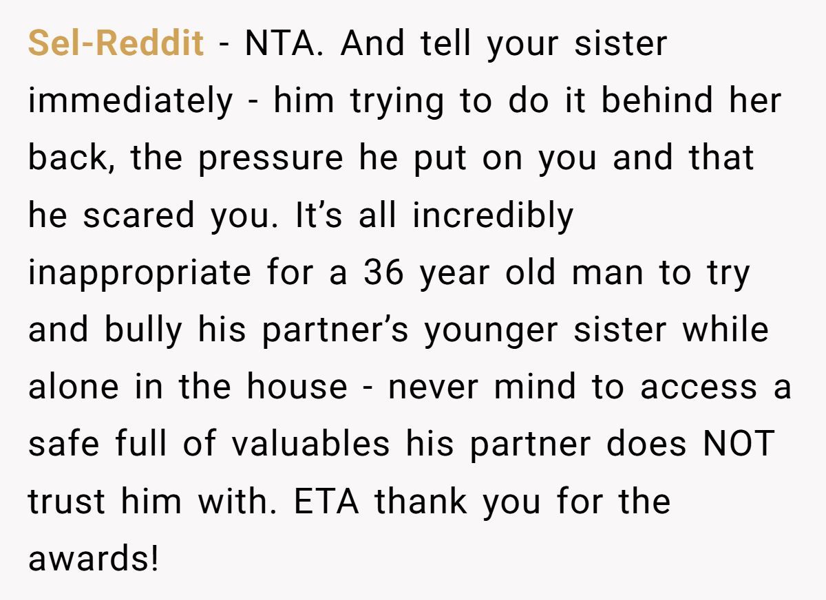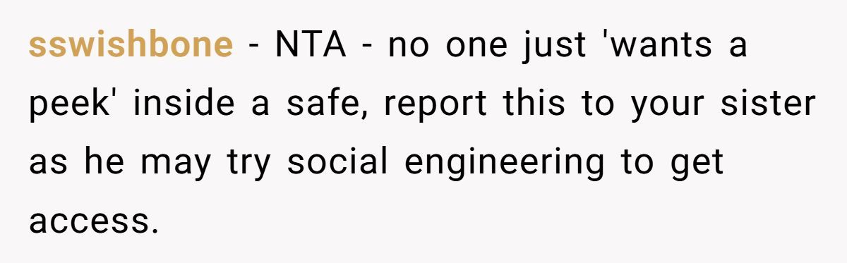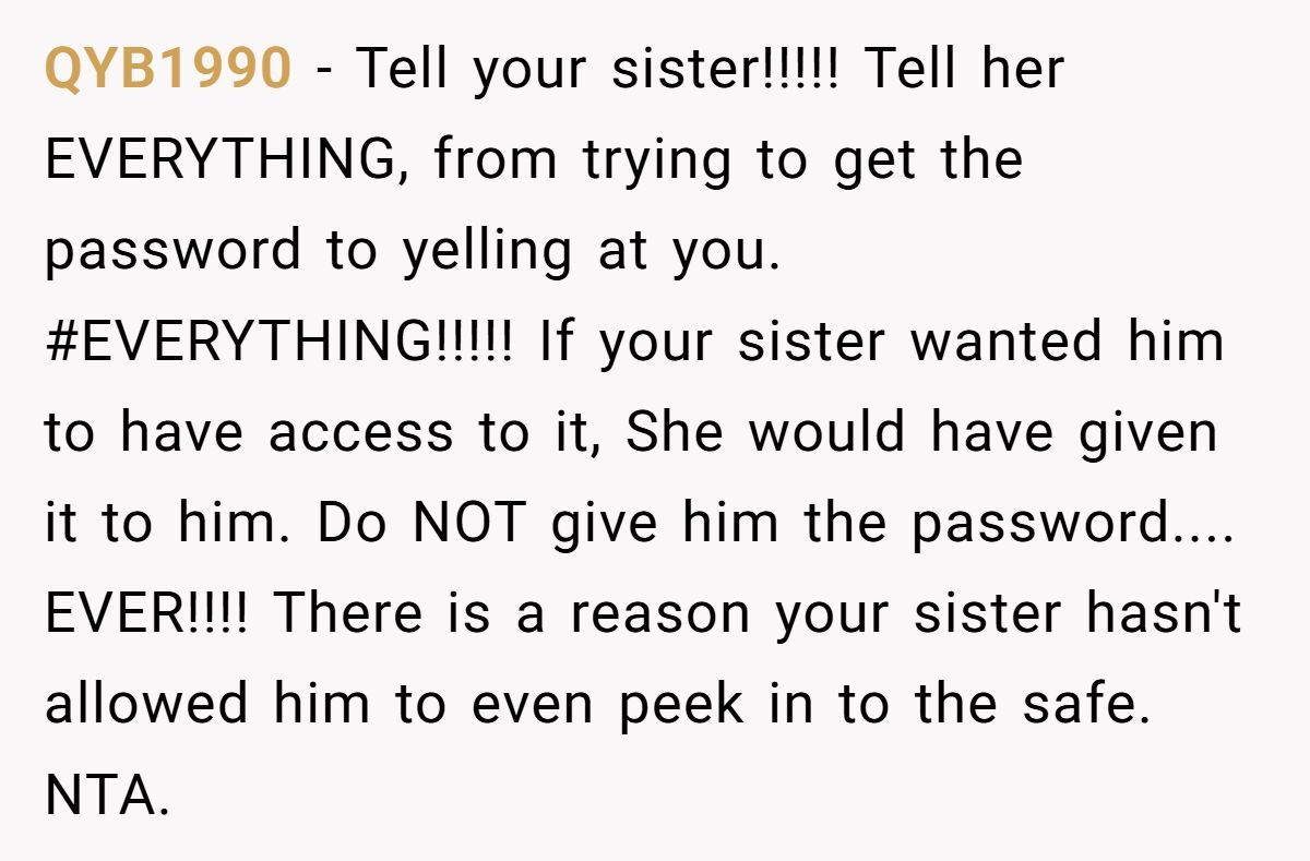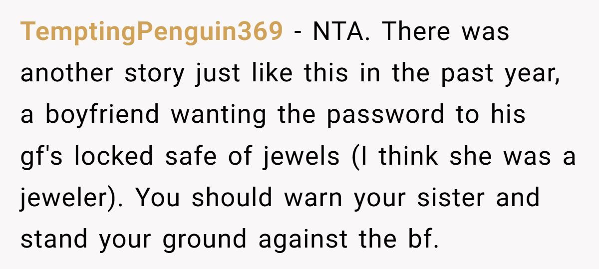 One woman shared on Reddit how refusing to give her sister’s boyfriend the password to a safe led to a heated argument and lingering unease