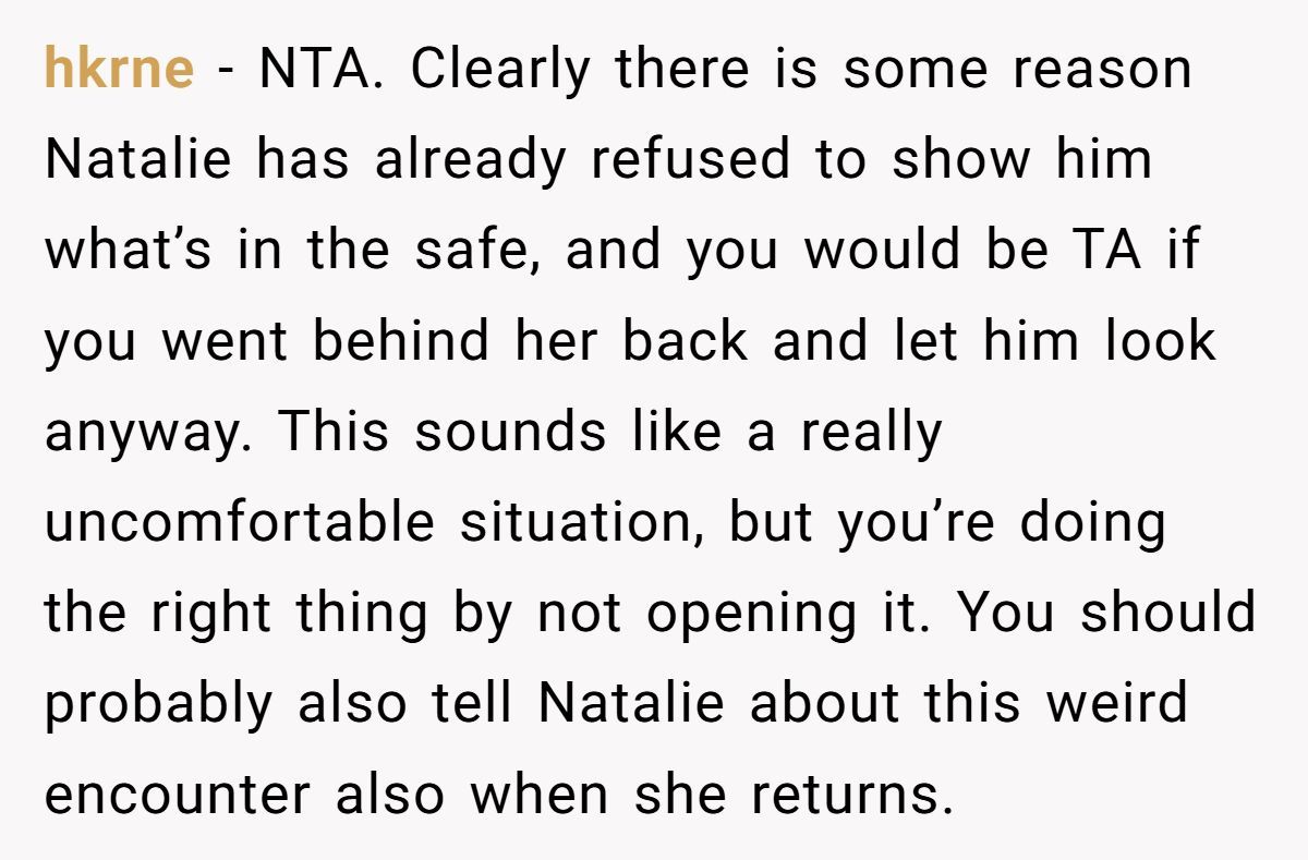 Users stressed informing Natalie fully, noting her prior refusal to show Micah the safe indicates she doesn’t trust him