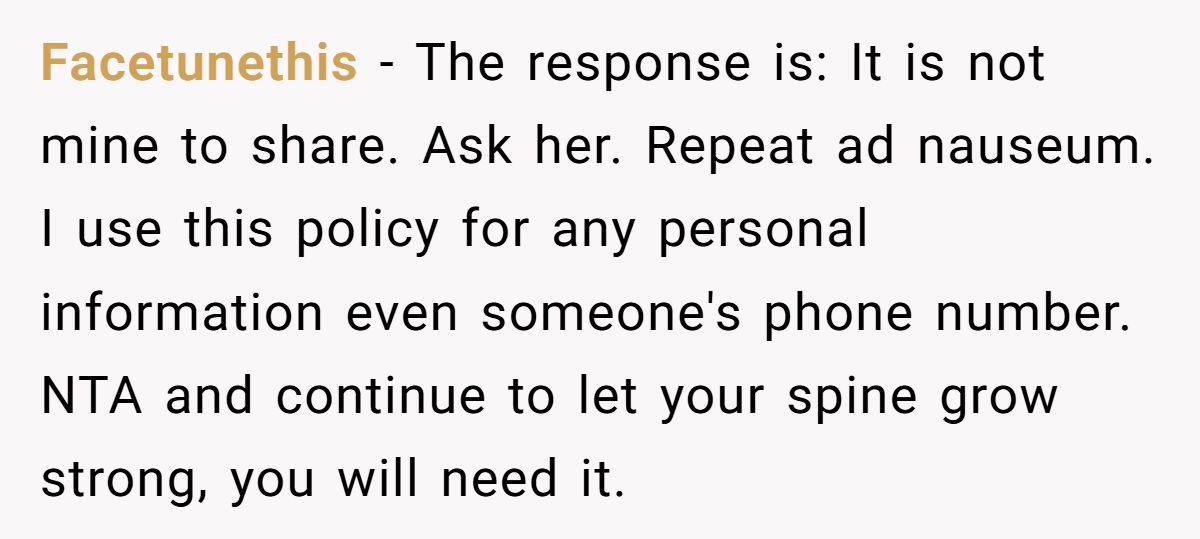 One commenter suggested a firm, repeated response—“It’s not mine to share, ask her”—to deflect Micah’s pressure while maintaining integrity