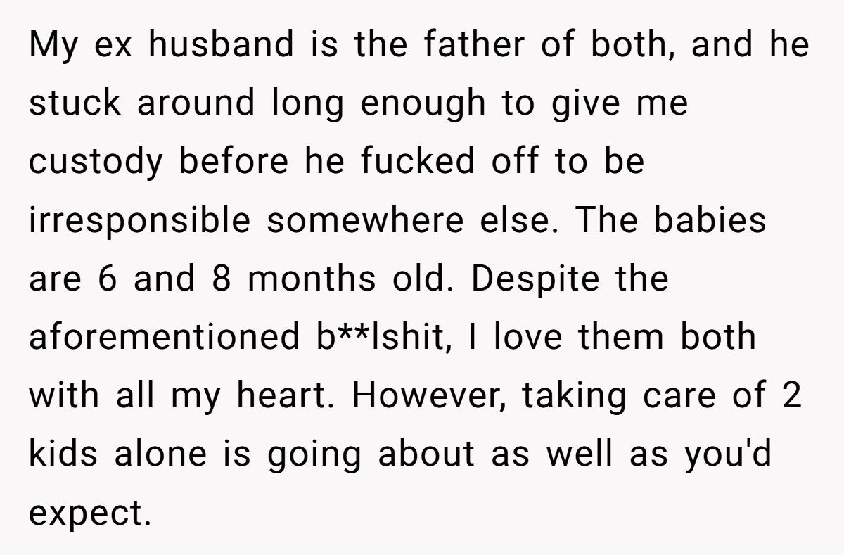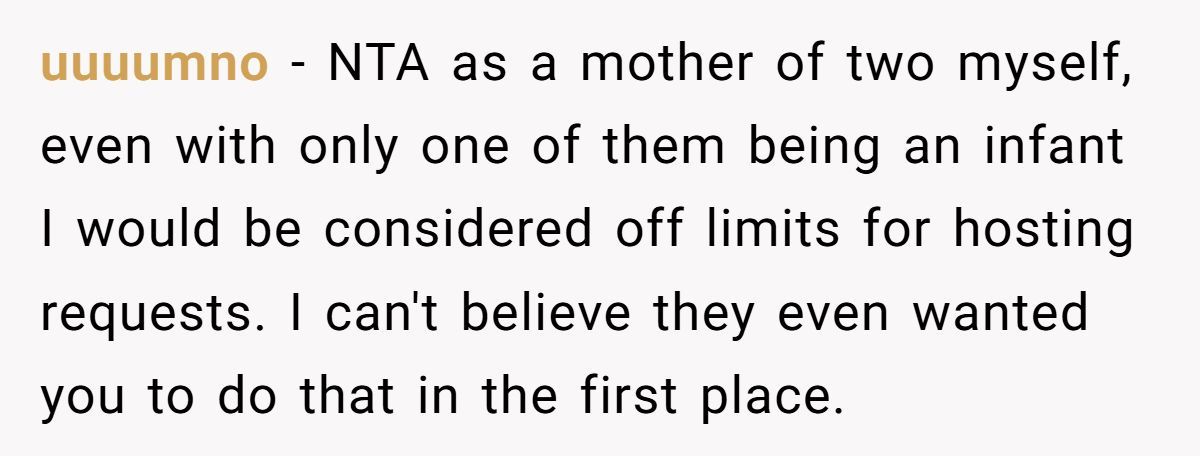 Raising two infants alone is a Herculean task. A 2022 study in Journal of Family Psychology found that single mothers of infants report 40% higher stress levels than partnered parents, often exacerbated by lack of family support. The Redditor’s conditions for hosting—small guest list, strict health precautions—showed her willingness to try, but her mother’s boundary violation (wanting to “hold” the babies she’d never met) tipped the scales. Her decision to shut down hosting reflects self-preservation, not selfishness.