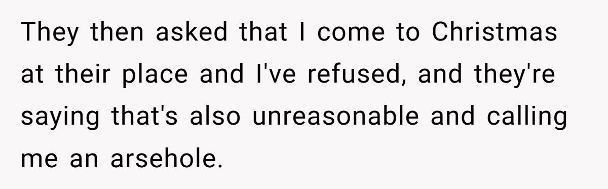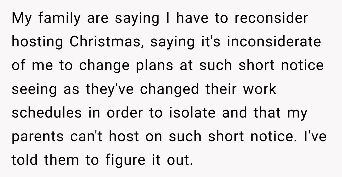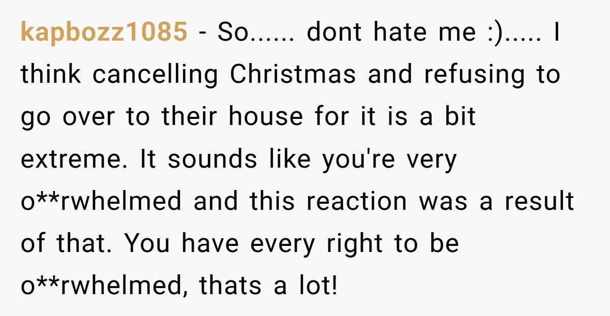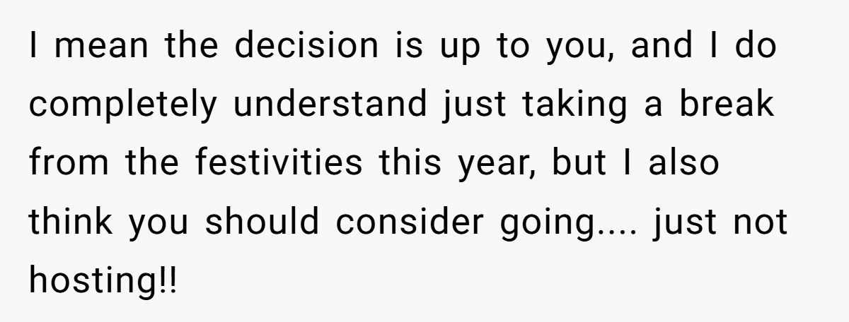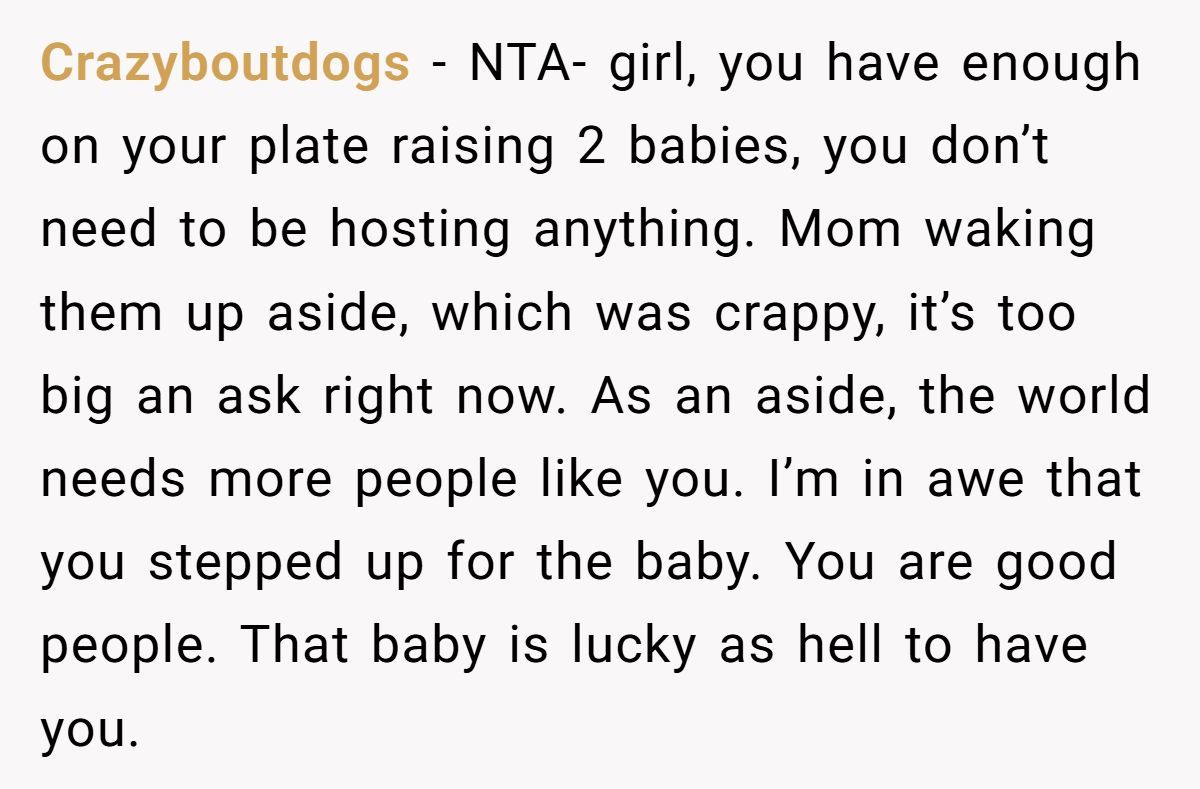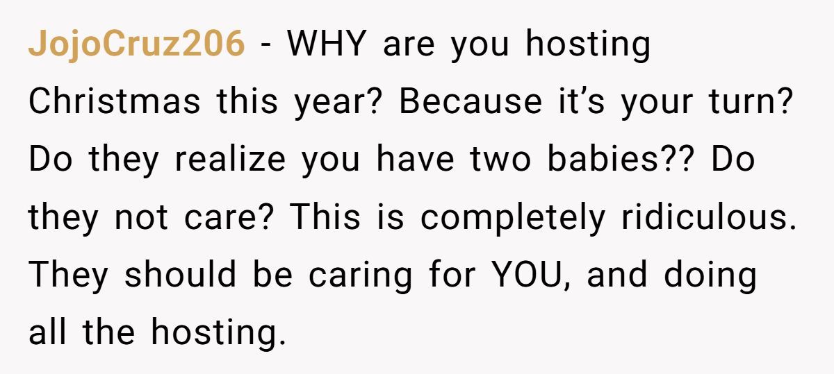 This Christmas hosting drama exploded when the Redditor’s mom woke her sleeping babies, prompting her to cancel hosting and skip her family’s alternative. Reddit mostly cheers her stand, citing her exhaustion as a single mom, though some suggest attending to keep ties.