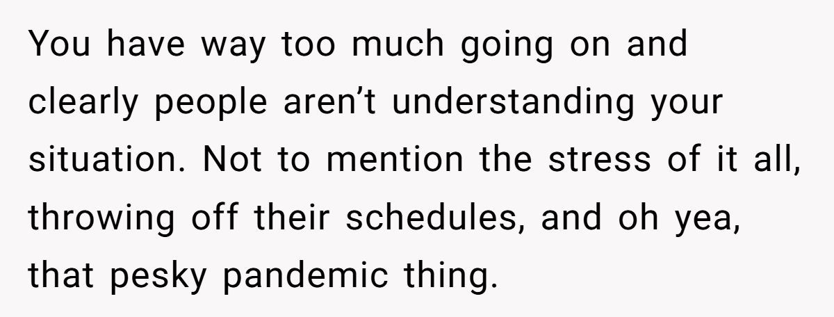 Dr. Harvey Karp, a parenting expert, notes, “Sleep is a lifeline for new parents; disruptions can unravel their well-being”. The mother’s actions, while possibly well-intentioned, ignored the Redditor’s fragile balance, and expecting her to host amid this chaos was unrealistic. The family’s pushback, citing their adjusted schedules, dismisses her exhaustion and the pandemic’s added strain.