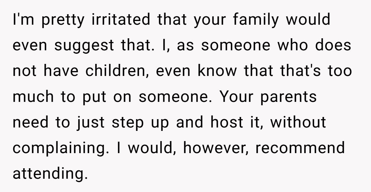 In the comments, Reddit users supported the Redditor’s refusal to host, declaring her not the jerk for prioritizing her well-being