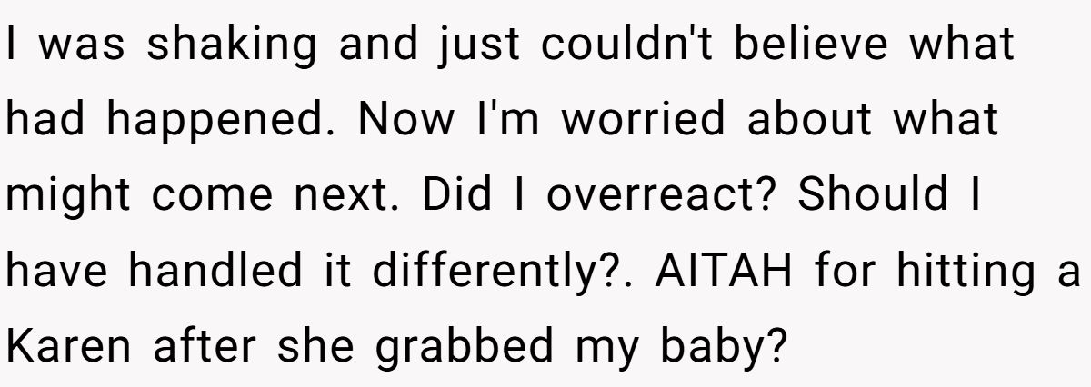 This Redditor’s slap to a baby-grabbing stranger was a gut reaction to a terrifying moment, but the crowd’s mixed response and assault accusations left her doubting. Was she right to fight back, or should she have stayed calm? How would you react if a stranger took your kid? Drop your thoughts below!