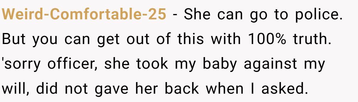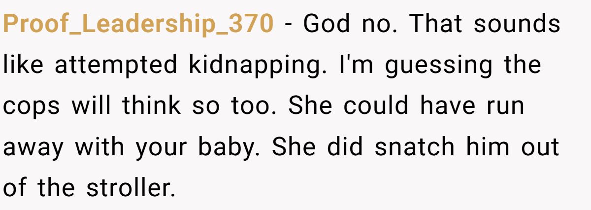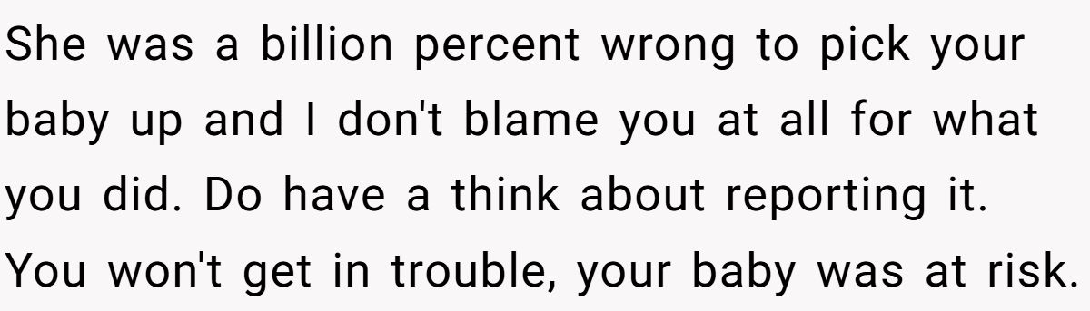 What’s the fix? Reporting the incident to police, as commenters suggested, could document the stranger’s behavior, especially if she’s a repeat offender. Gathering witness contacts would’ve strengthened her case. Counseling might help process the trauma. She did right by her baby, but documenting it ensures safety. Readers, would you have swung or stayed calm in this panic? Let’s dish!