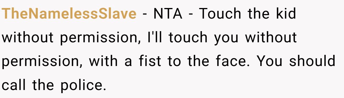 The stranger’s behavior raises red flags—her actions mirror patterns of boundary violation, and some commenters’ concerns about attempted kidnapping aren’t far-fetched. A 2022 FBI report notes over 1,000 attempted child abductions annually in the U.S., often starting with unsolicited contact. The crowd’s mixed reaction reflects society’s split on physical responses, but legally, parents can use reasonable force to protect their child (source: FindLaw).