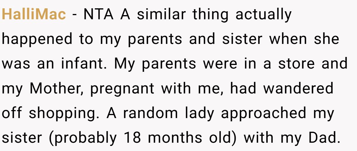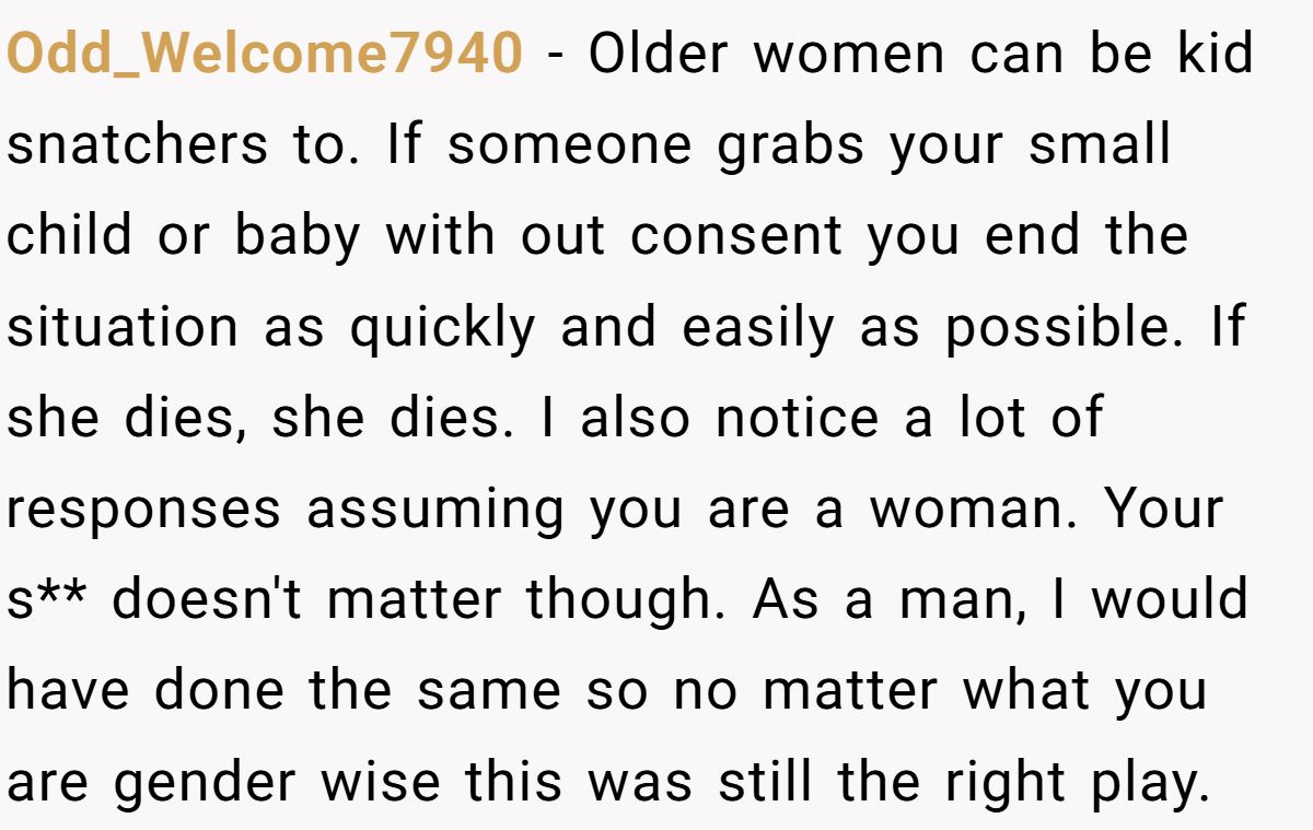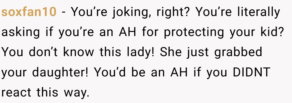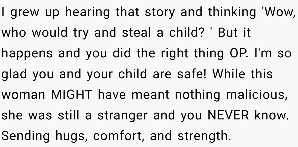 One shared a chilling story of a similar incident where a stranger tried to walk off with a child, reinforcing the Redditor’s reaction as reasonable