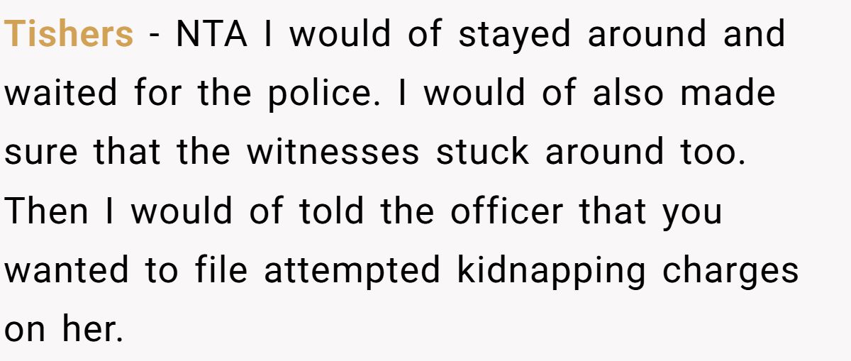 Commenters urged reporting the incident, noting the woman’s behavior was dangerous and possibly a pattern, with police likely siding with the parent