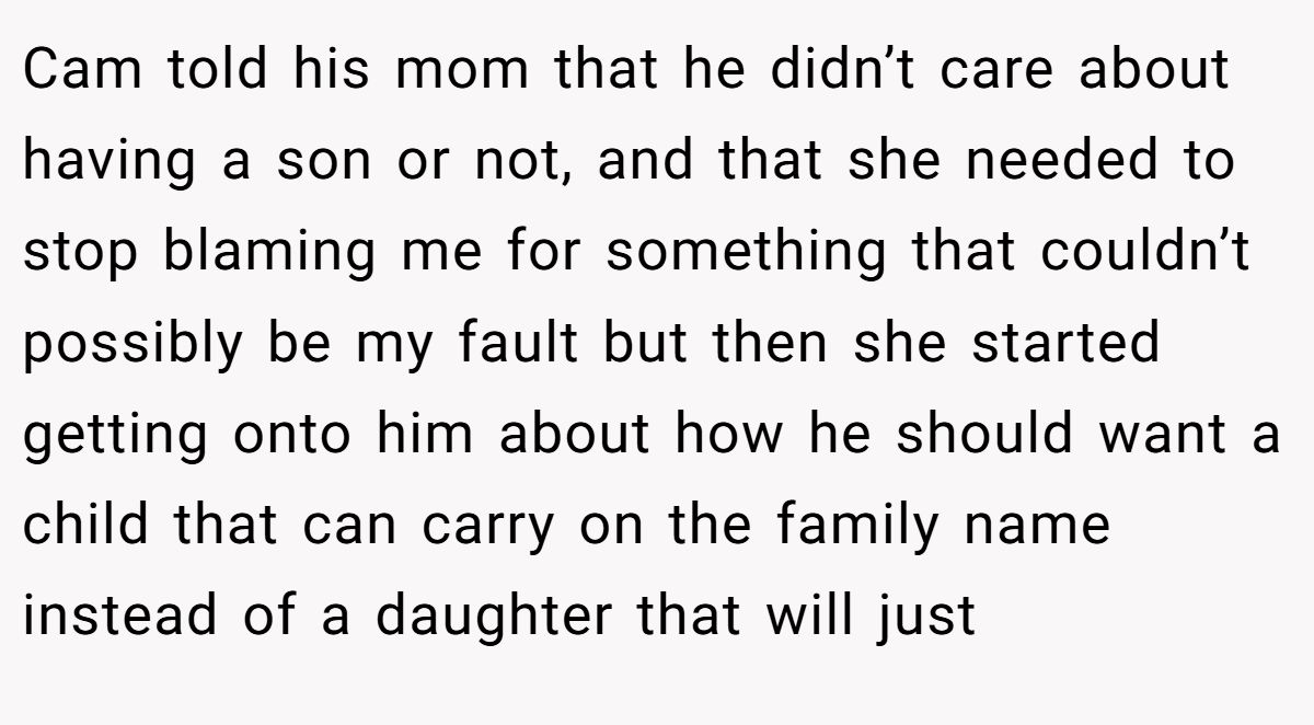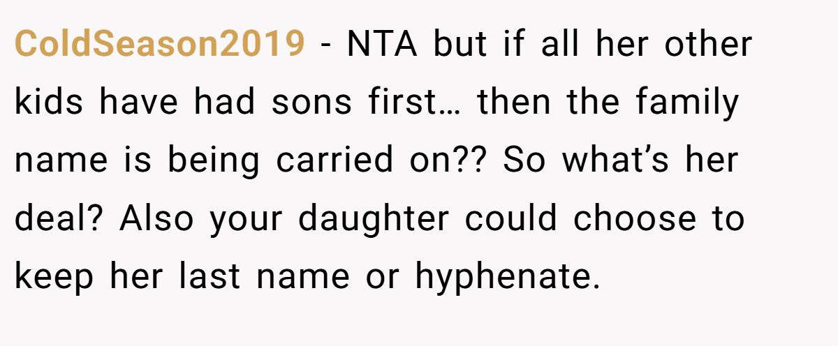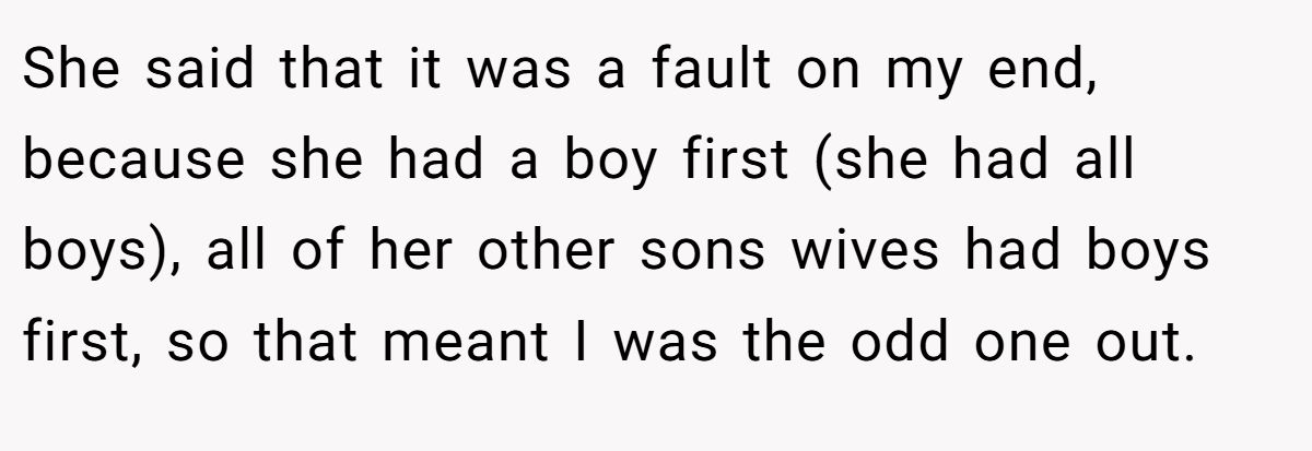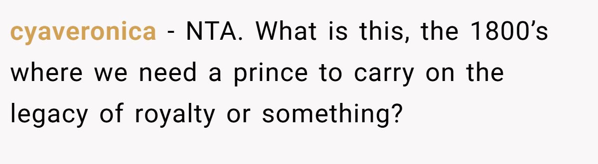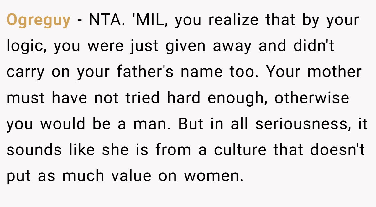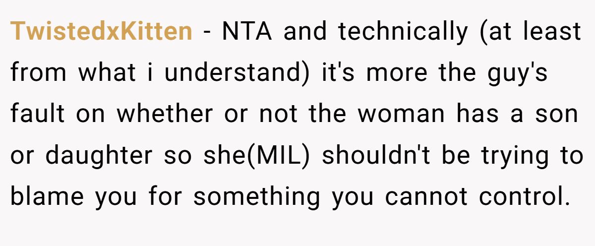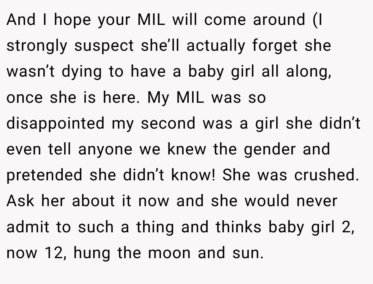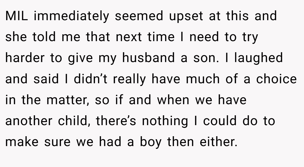 Gender expectations can strain family ties. Dr. Cordelia Harris, a family therapist, notes in a 2023 Psychology Today article, “Outdated gender biases in families can undermine new parents’ joy”. The MIL’s fixation on a male heir, rooted in a family pattern of first-born sons, dismisses basic biology—sperm determines sex, not maternal effort. Her claim that daughters are “given away” devalues the Redditor’s child before birth, warranting the pushback.
