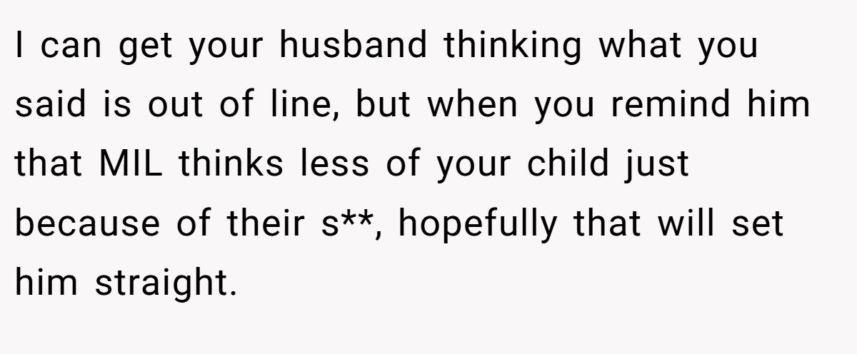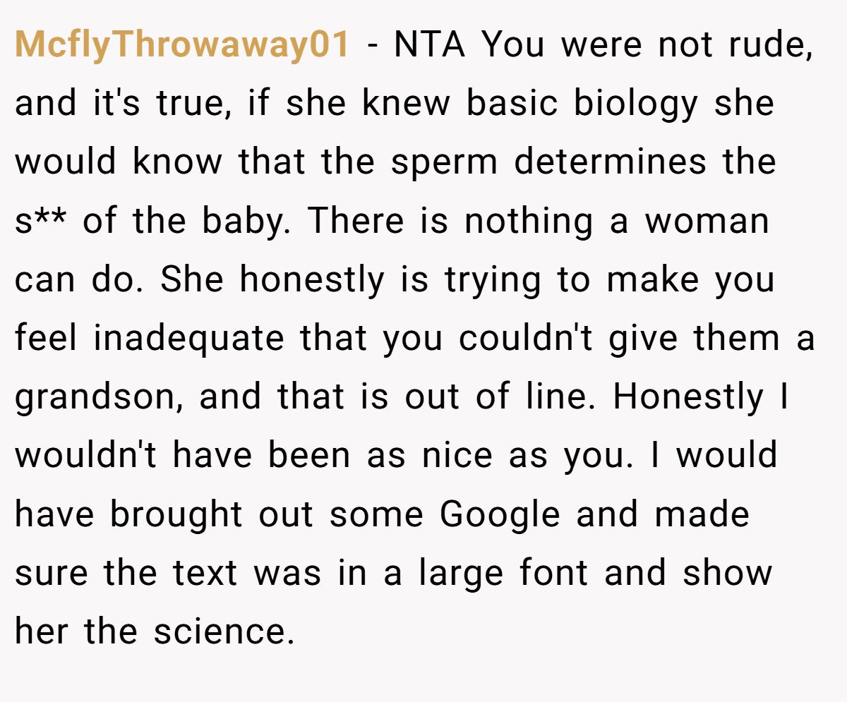 Could this have been softer? A gentler explanation of biology might’ve avoided the husband’s unease, but the MIL’s blame invited a firm response. Neutral advice? The Redditor should discuss her husband’s feelings, reaffirm their daughter’s value, and set boundaries with MIL. An apology for tone, not content, could ease tension. What do you think—sassy triumph or family misstep?