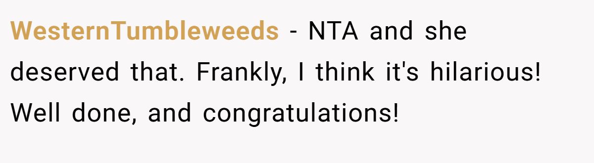WesternTumbleweeds called the Redditor’s response hilarious, fully supporting her.