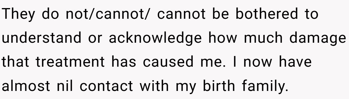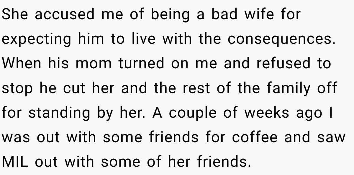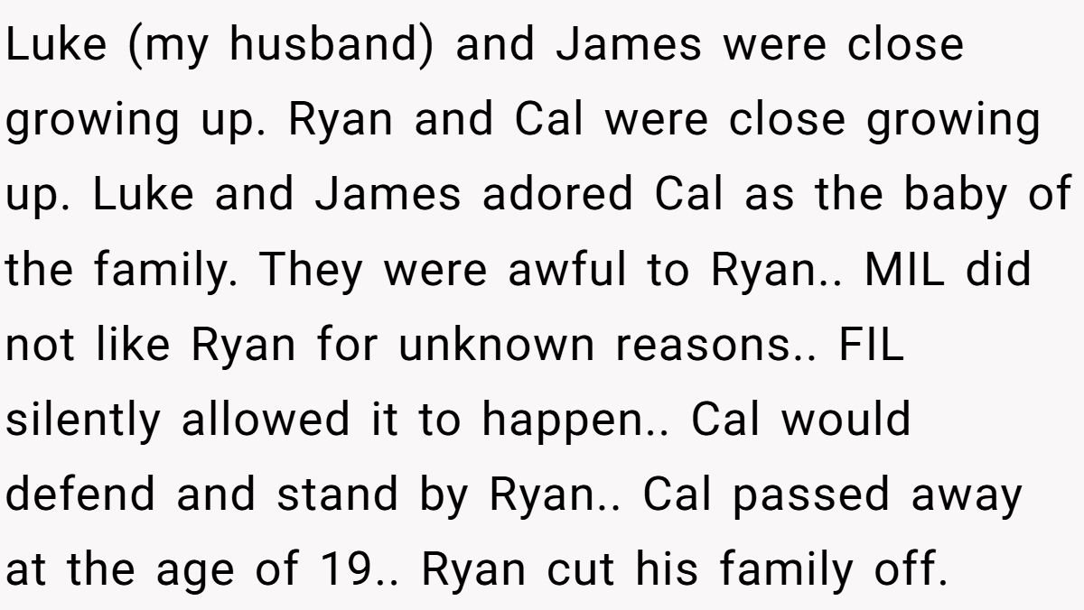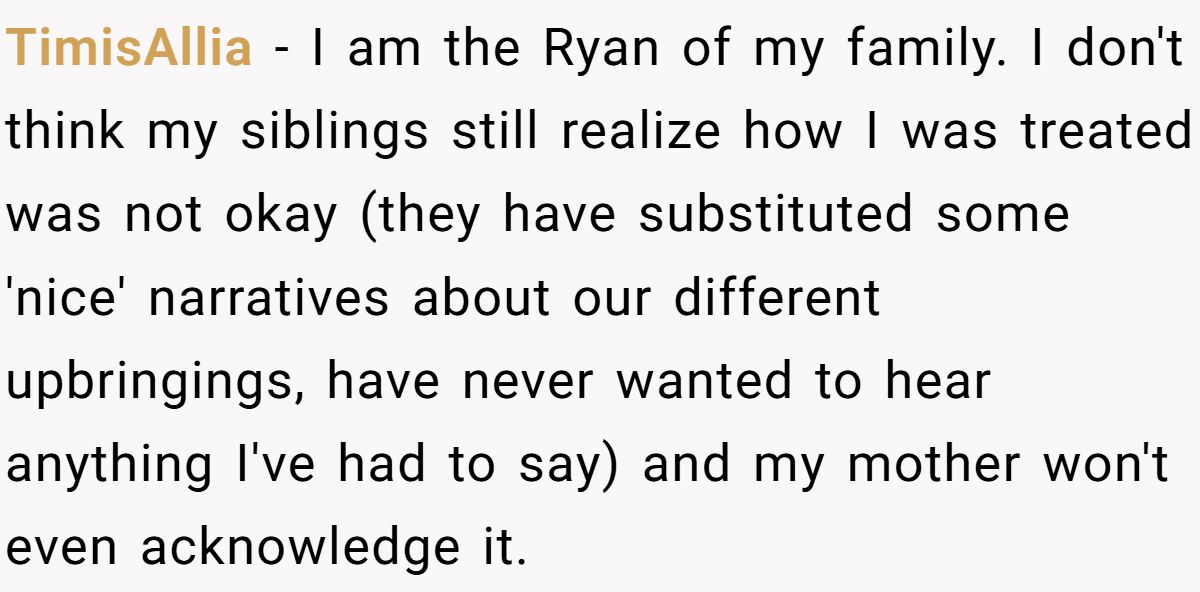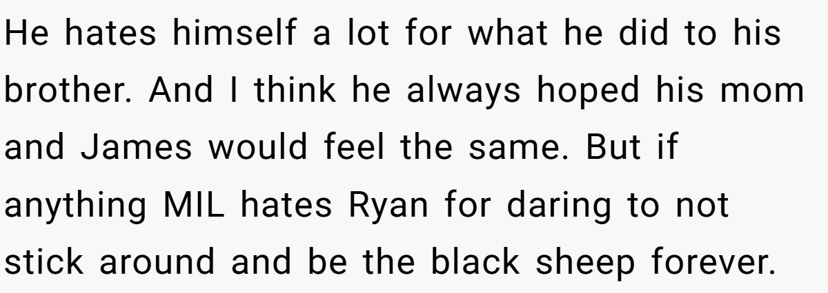 That’s exactly what seems to have happened here. The MIL refuses to acknowledge her role in the estrangement. Instead, she rewrites history to place blame on her daughter-in-law. But the truth? Her youngest son Ryan was emotionally neglected and mistreated for years. Her oldest son (the Redditor’s husband) has since gone to therapy, taken accountability, and chosen to protect his mental health by going no contact.