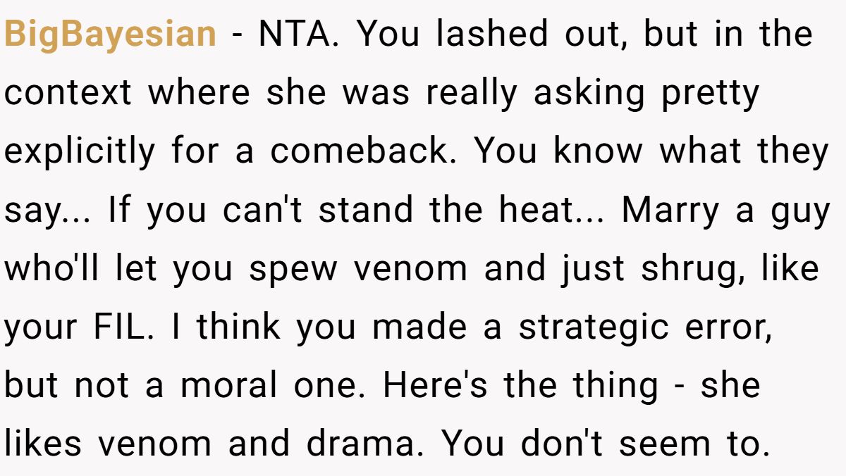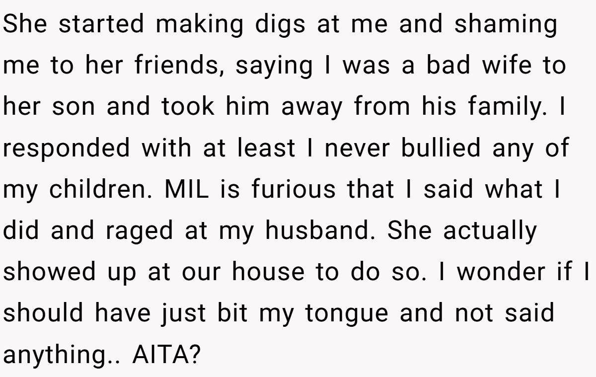 The woman, now a mom herself, knew the history. She knew her husband had grown, healed, and cut ties for a reason. So when her MIL started bad-mouthing her in front of others, she didn’t hold back. She hit back with: “At least I never bullied any of my children.” Now her MIL is furious, her husband is caught in the crossfire, and she’s left wondering—did she go too far?