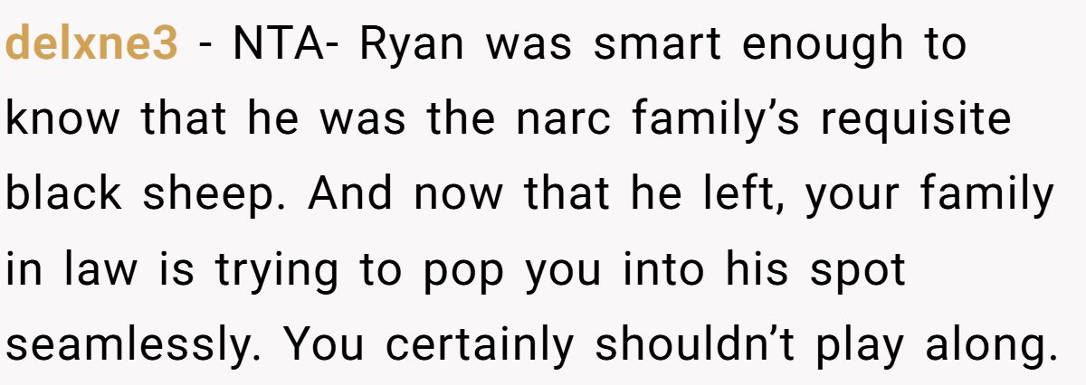 Dr. Lindsay Gibson, author of Adult Children of Emotionally Immature Parents, says these situations often involve “emotional scapegoats”—children who are blamed, shamed, or ignored while other family members go along with the dysfunction. Ryan, the scapegoat, eventually walked away. And now the MIL is repeating the cycle—this time targeting her daughter-in-law.