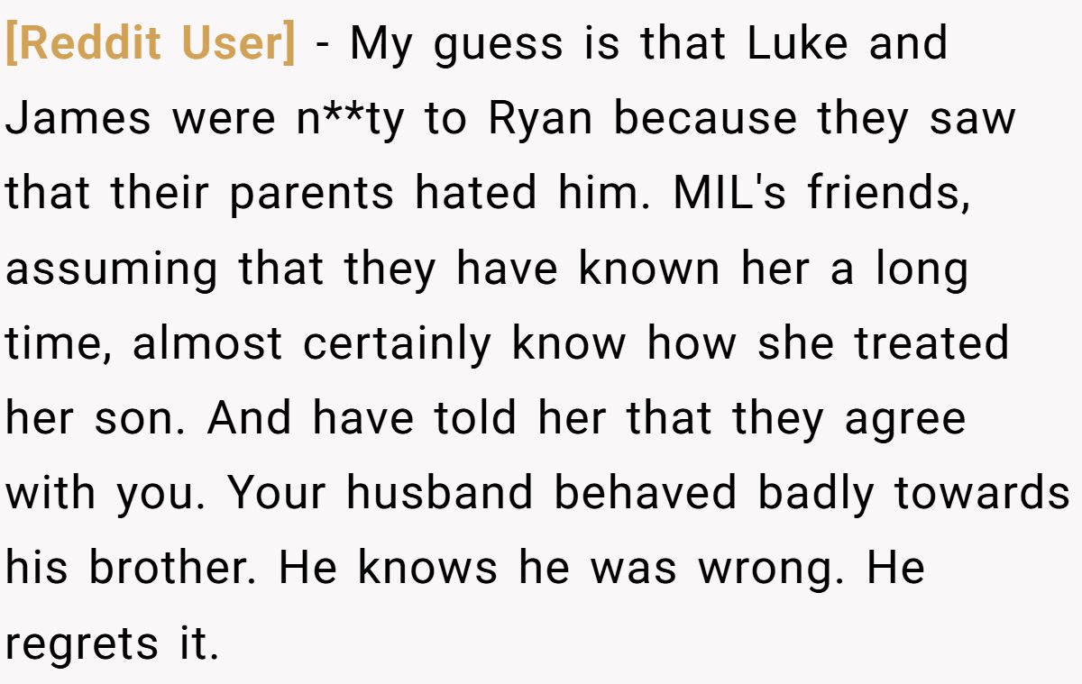 ![Mother-In-Law Said Daughter-In-Law Was A Bad Wife—So She Fired Back With The One Thing That Shut Her Up [Reddit User] − My guess is that Luke and James were n**ty to Ryan because they saw that their parents hated him. MIL's friends, assuming that they have known her a long time, almost certainly know how she treated her son. And have told her that they agree with you. Your husband behaved badly towards his brother. He knows he was wrong. He regrets it.](https://dailyhighlight.com/wp-content/uploads/2025/07/45618-18.jpg)