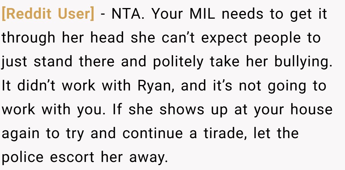 ![Mother-In-Law Said Daughter-In-Law Was A Bad Wife—So She Fired Back With The One Thing That Shut Her Up [Reddit User] − NTA. Your MIL needs to get it through her head she can’t expect people to just stand there and politely take her bullying. It didn’t work with Ryan, and it’s not going to work with you. If she shows up at your house again to try and continue a tirade, let the police escort her away.](https://dailyhighlight.com/wp-content/uploads/2025/07/45618-20.jpg)