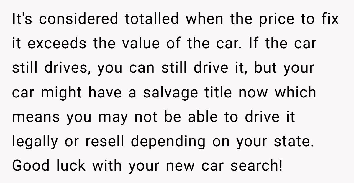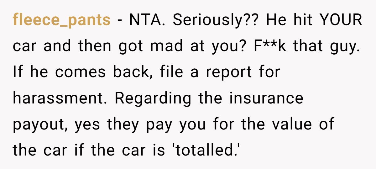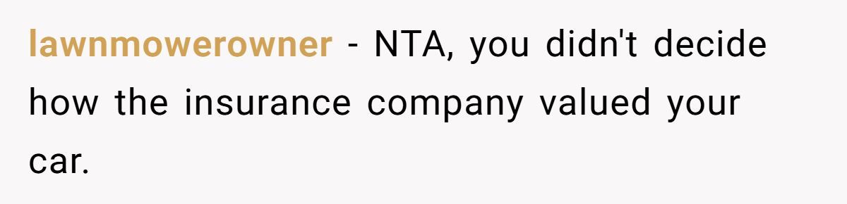 Some praised the Redditor’s move, noting the insurance payout was fair and her car’s value wasn’t her fault