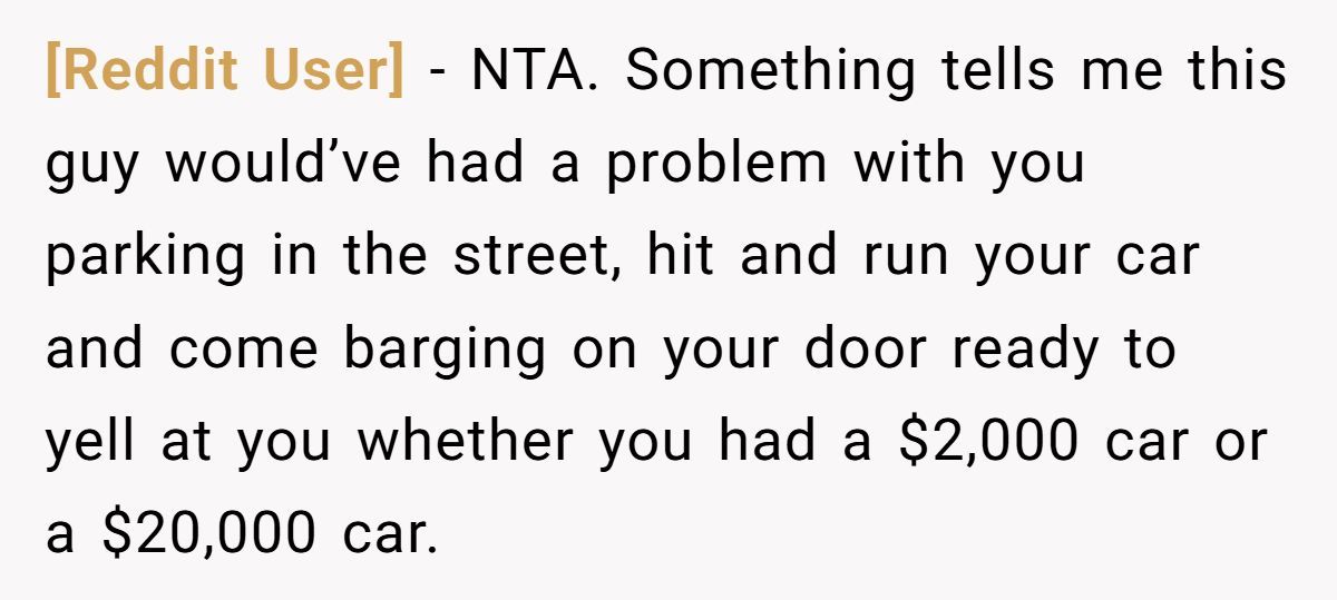 These Redditors supported the claim, calling the neighbor’s behavior entitled and his parking complaints unreasonable