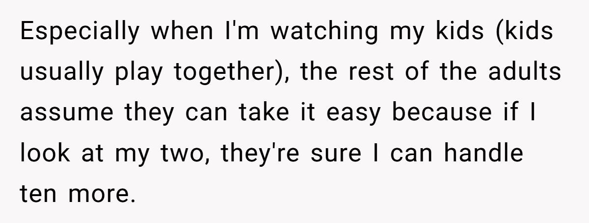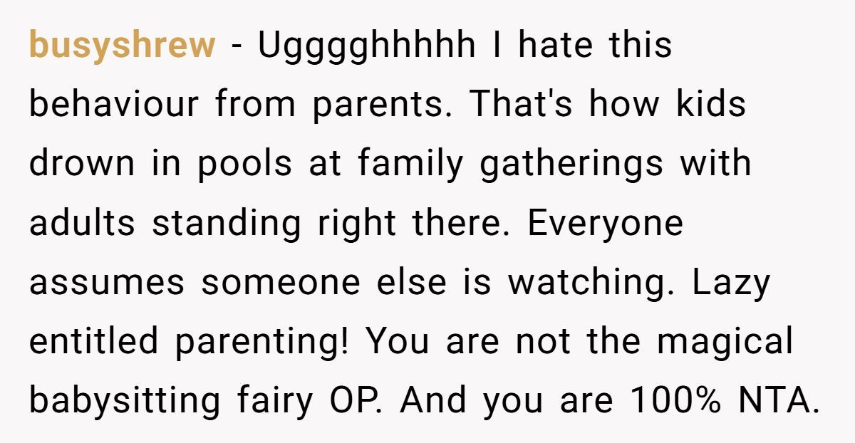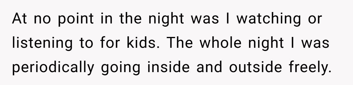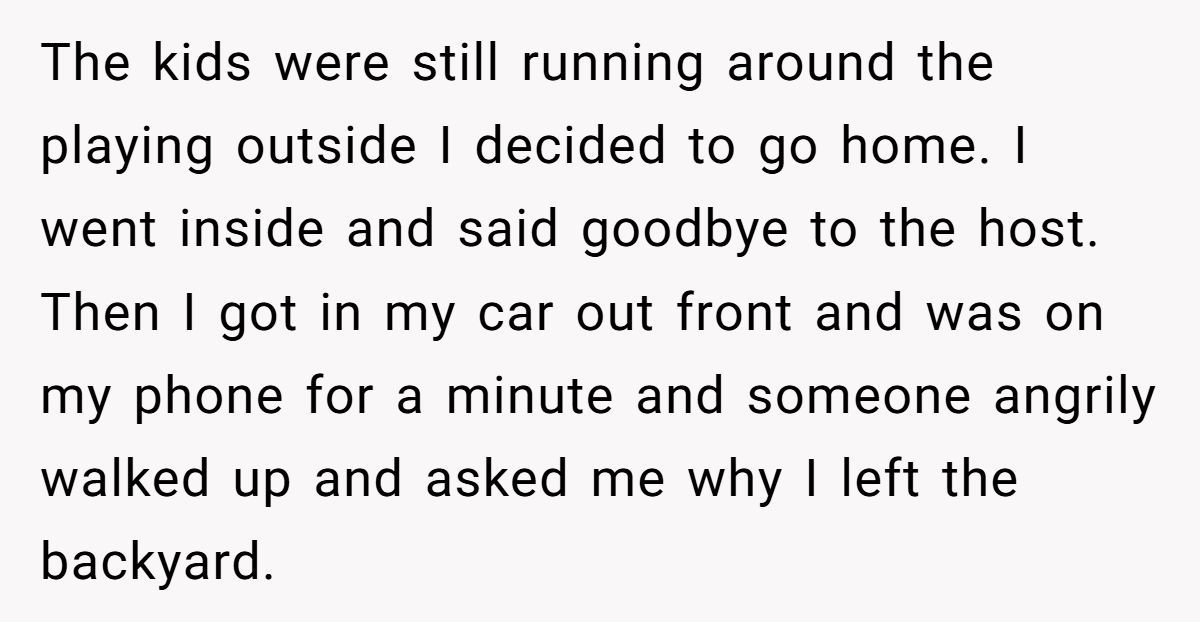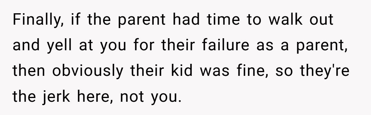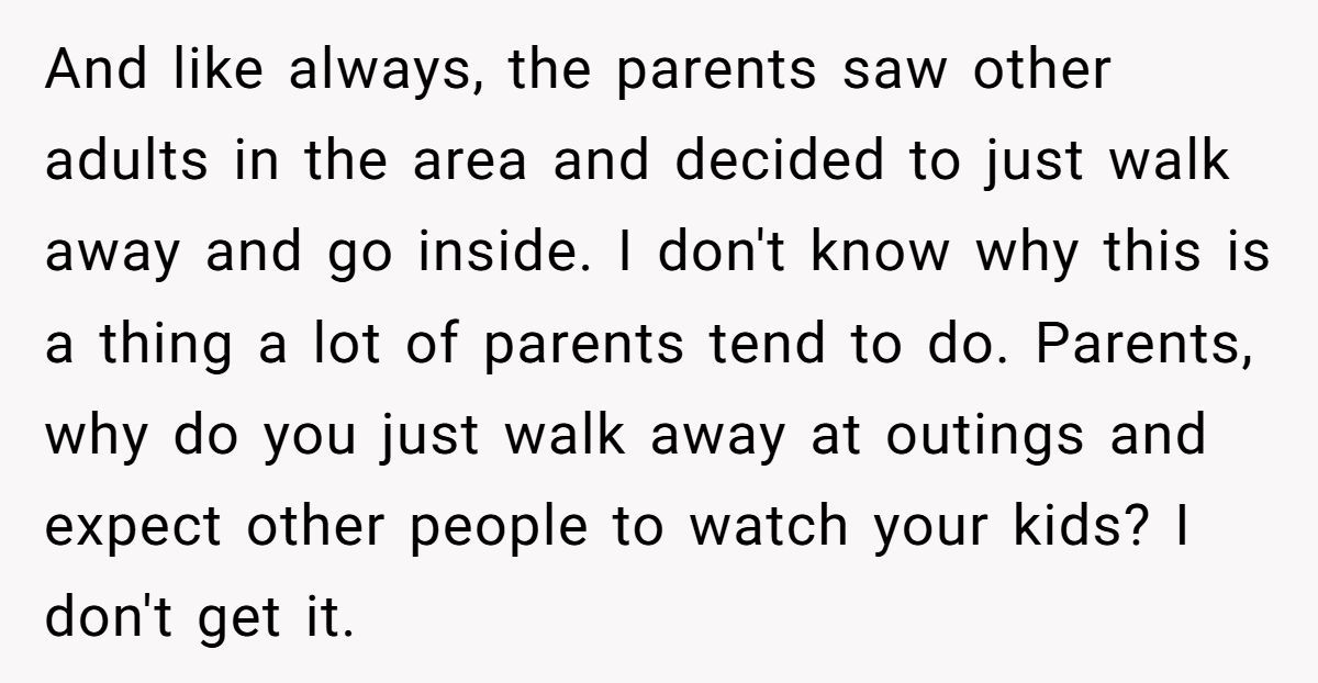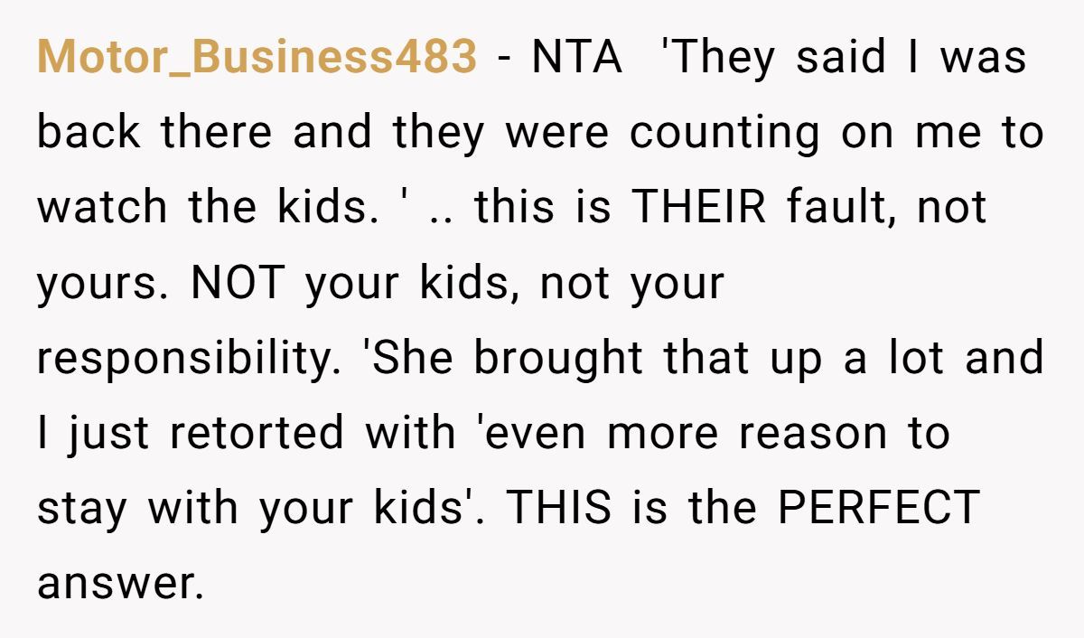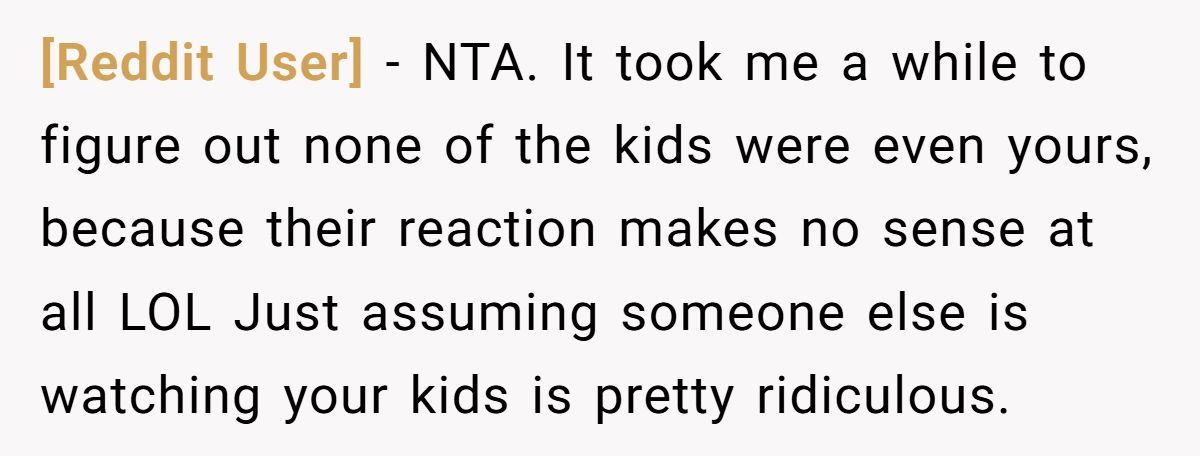But soon after, chaos erupted. One of the parents realized he was gone and launched into a full-blown meltdown, furious that he hadn’t stayed behind to watch the children. The Redditor was confused. He hadn’t been assigned any responsibility, and there were plenty of adults inside. He fired back with a stinging but honest comment: “That’s even more reason to stay with your kids.”