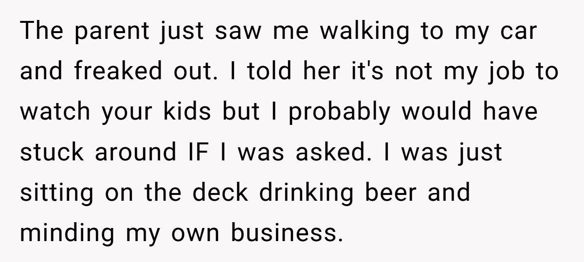 Talk about a BBQ that went from chill to grill in a heartbeat. This Redditor was just enjoying a cold one when a parent assumed he was on kid-watching duty—no memo, no request, just pure expectation. When he left the unfenced backyard, which opened into a forest, the parent’s meltdown was hotter than the coals. Let’s unpack this parenting pickle with a dash of sass and some wisdom.
