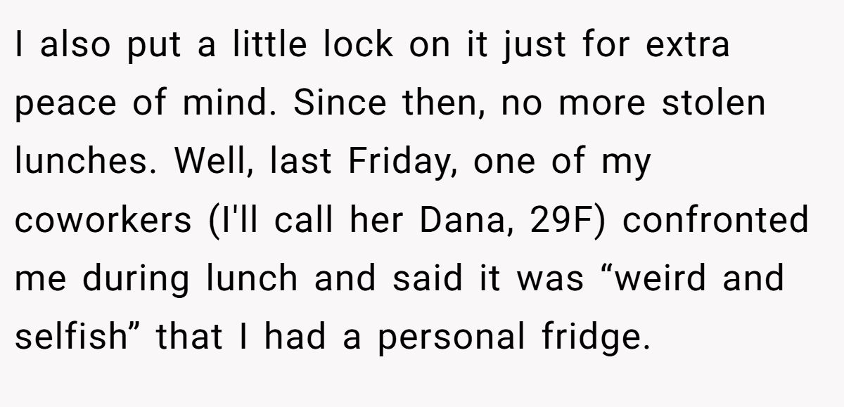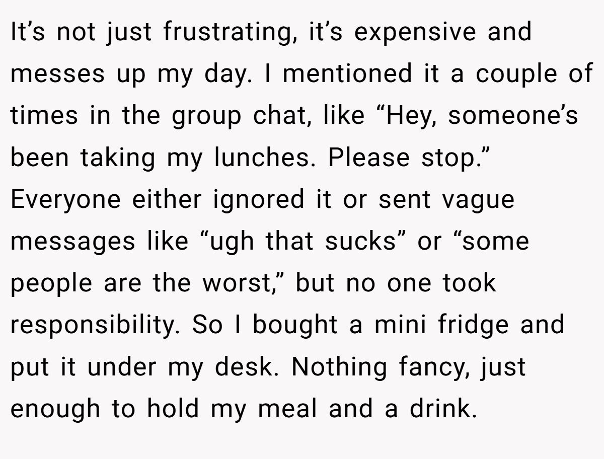 After no one owned up and the polite warnings went ignored, he bought himself a little desk fridge and locked it. Problem solved, right? Not quite. That’s when things got weird. A particular coworker called him “paranoid” and “not a team player,” while others began making snide comments.
